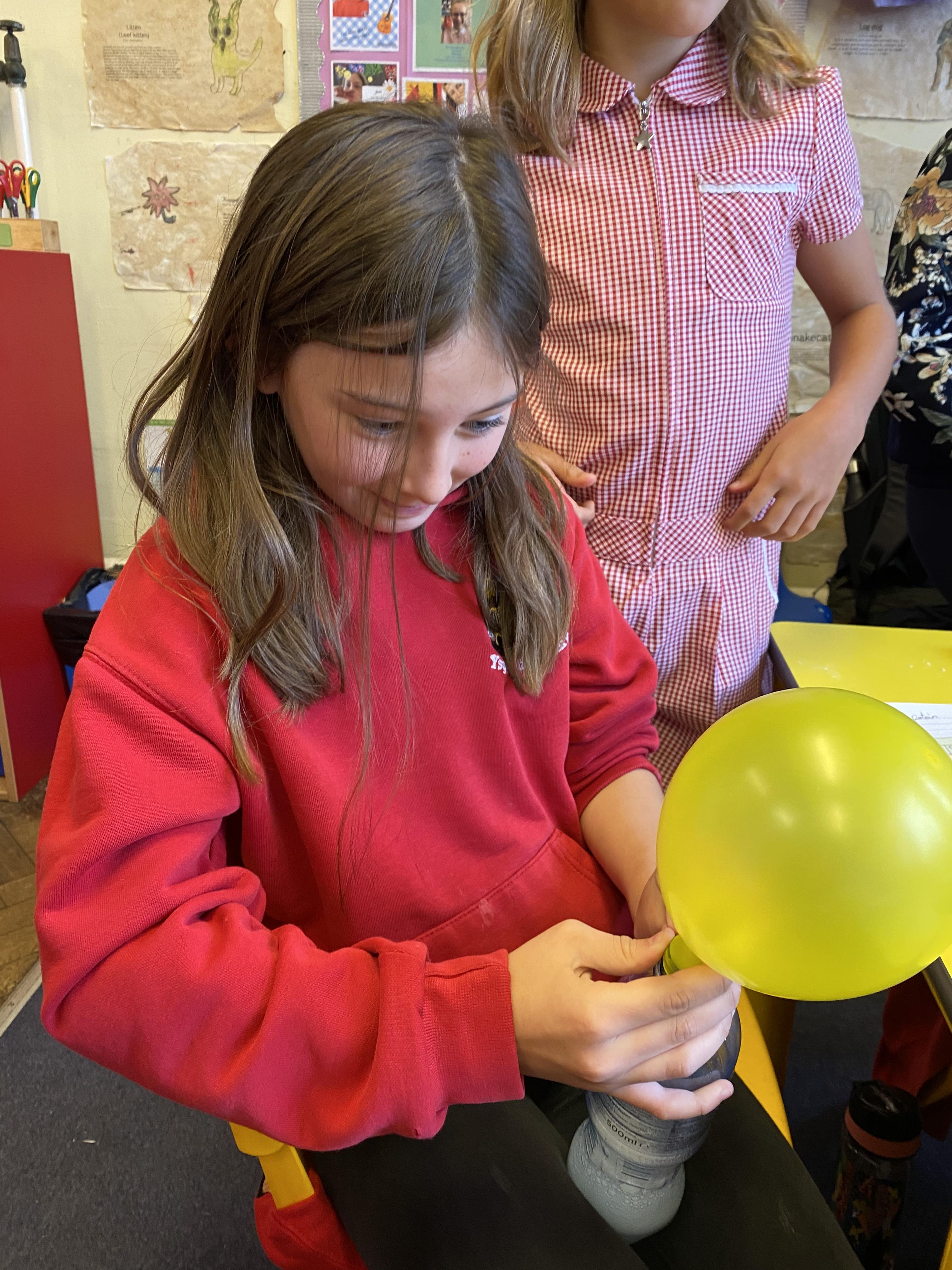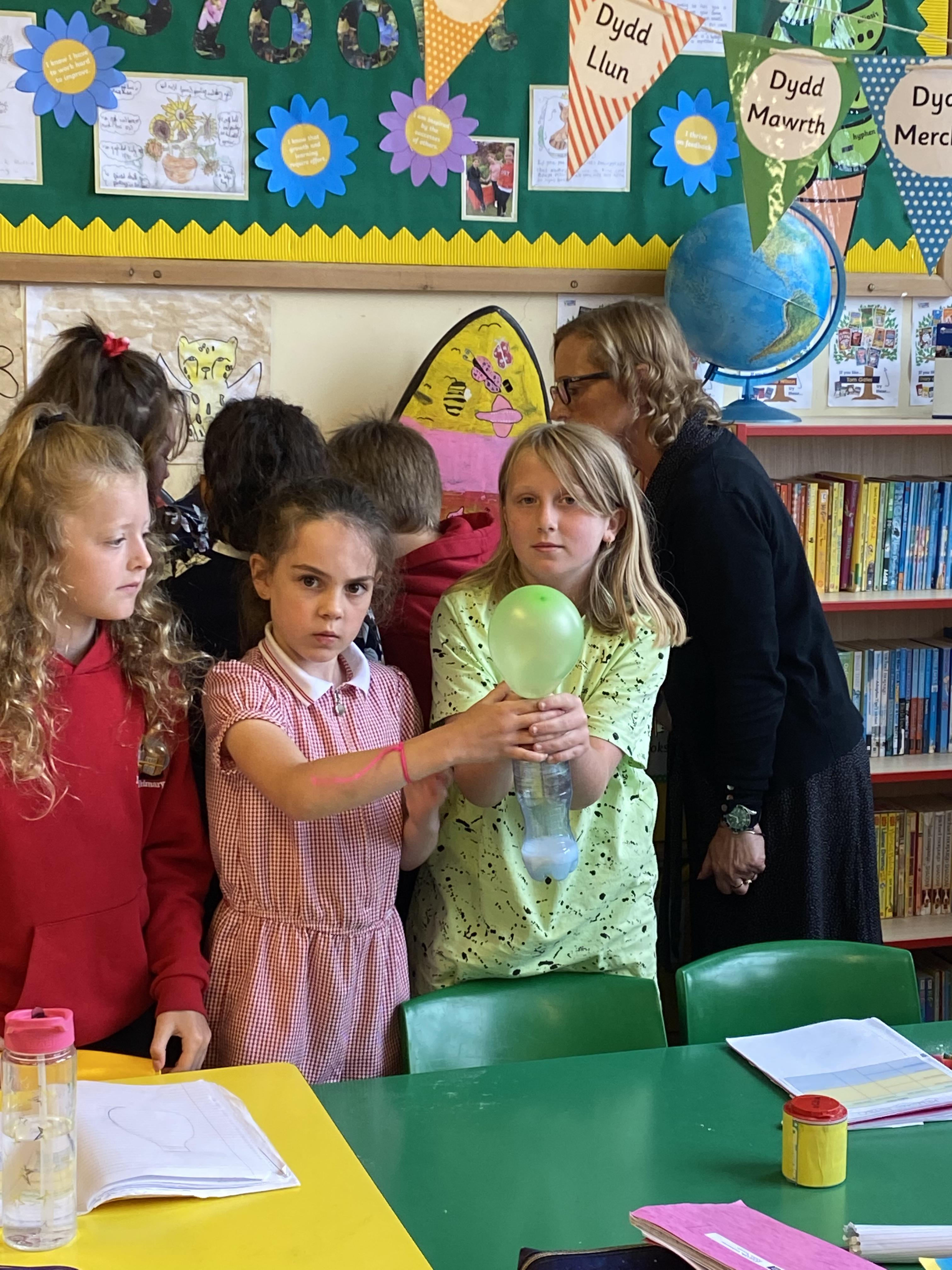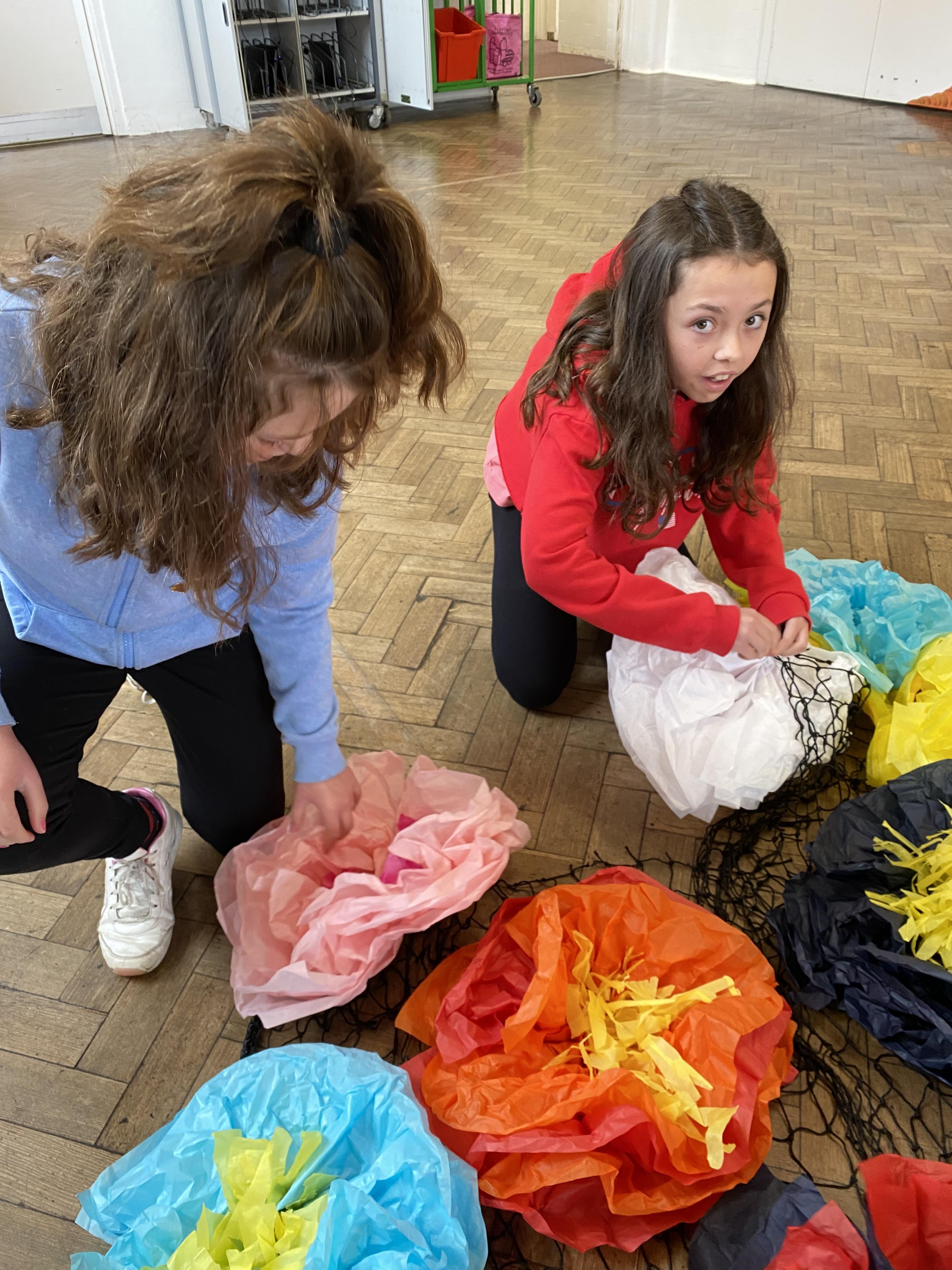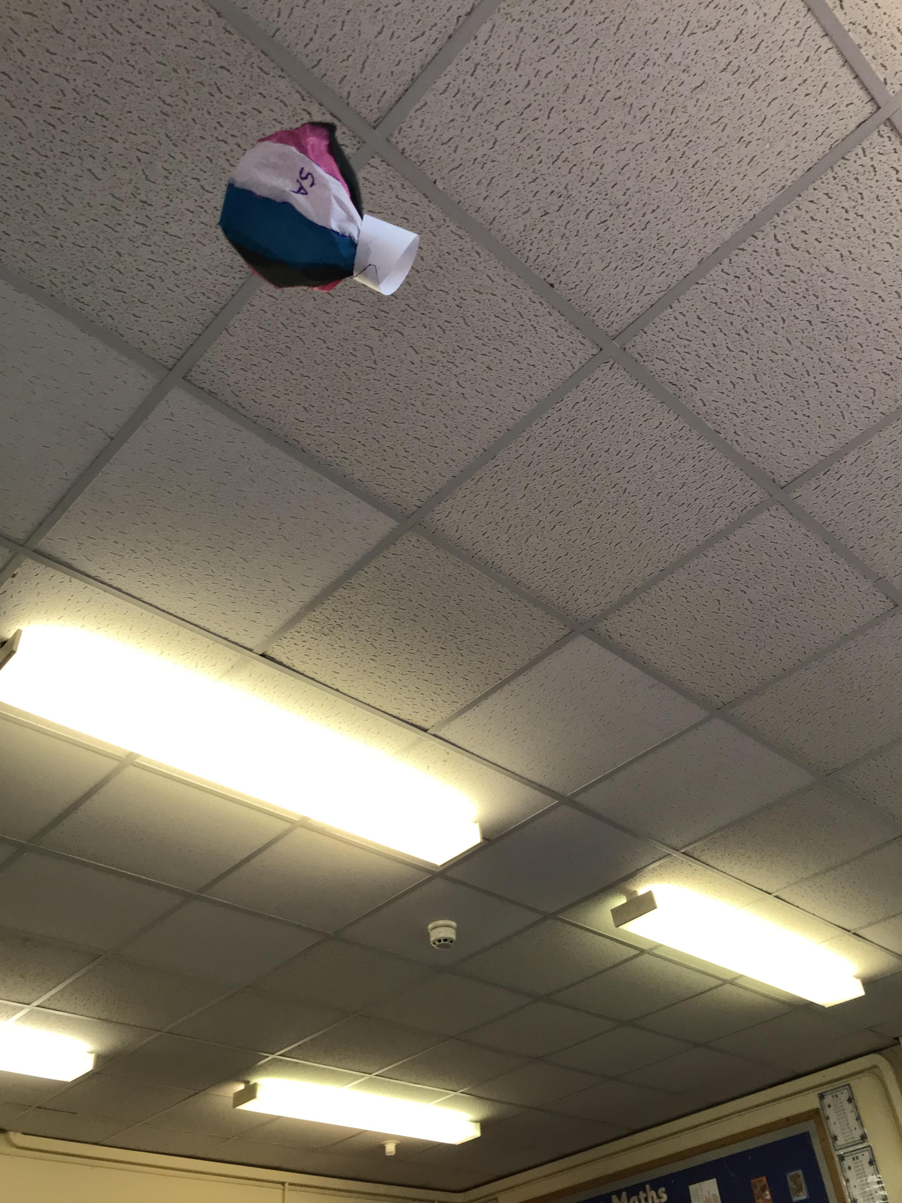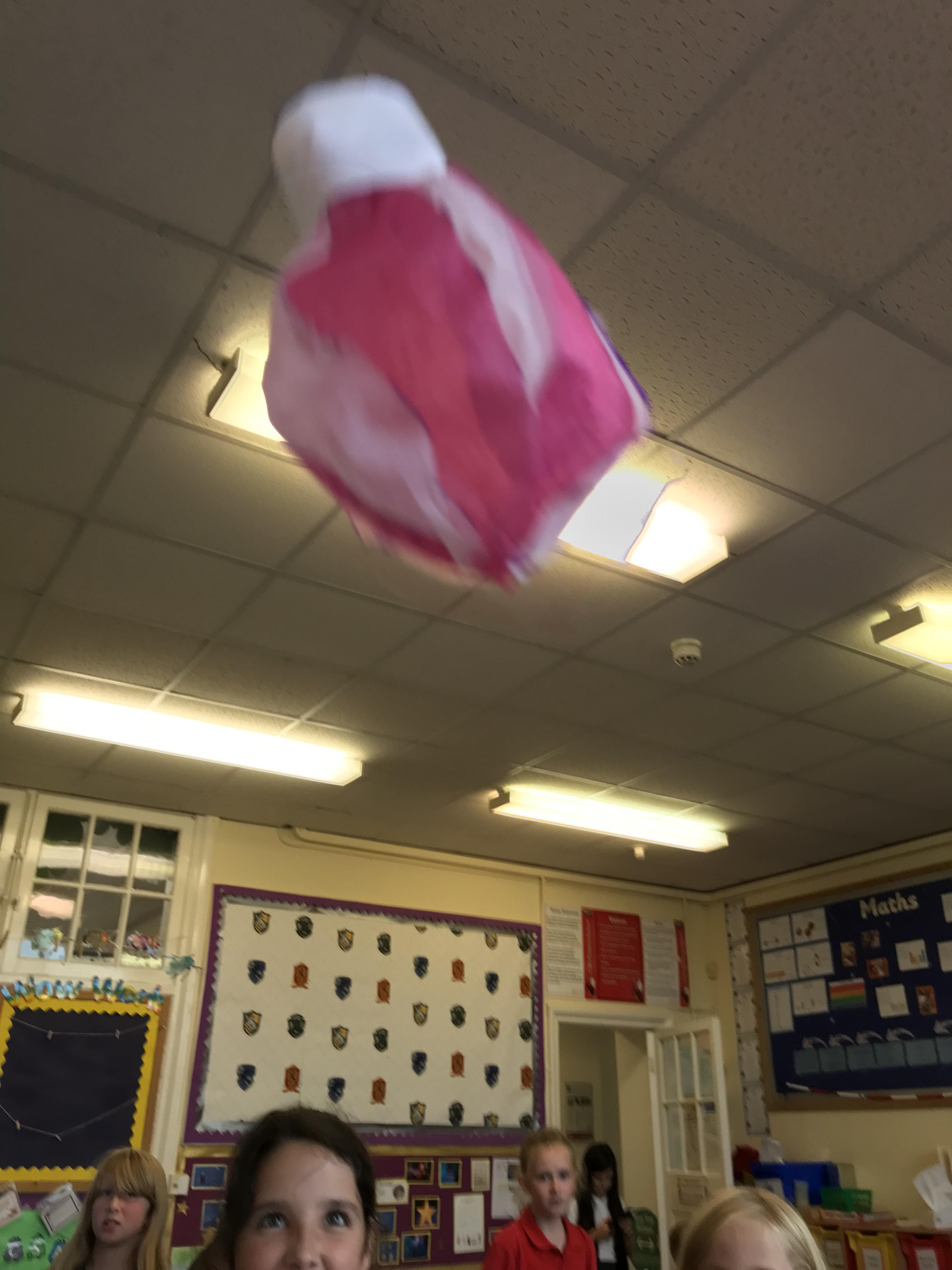 We made some hot-air balloons out of crepe paper, then used a hair dryer to heat up the air inside them