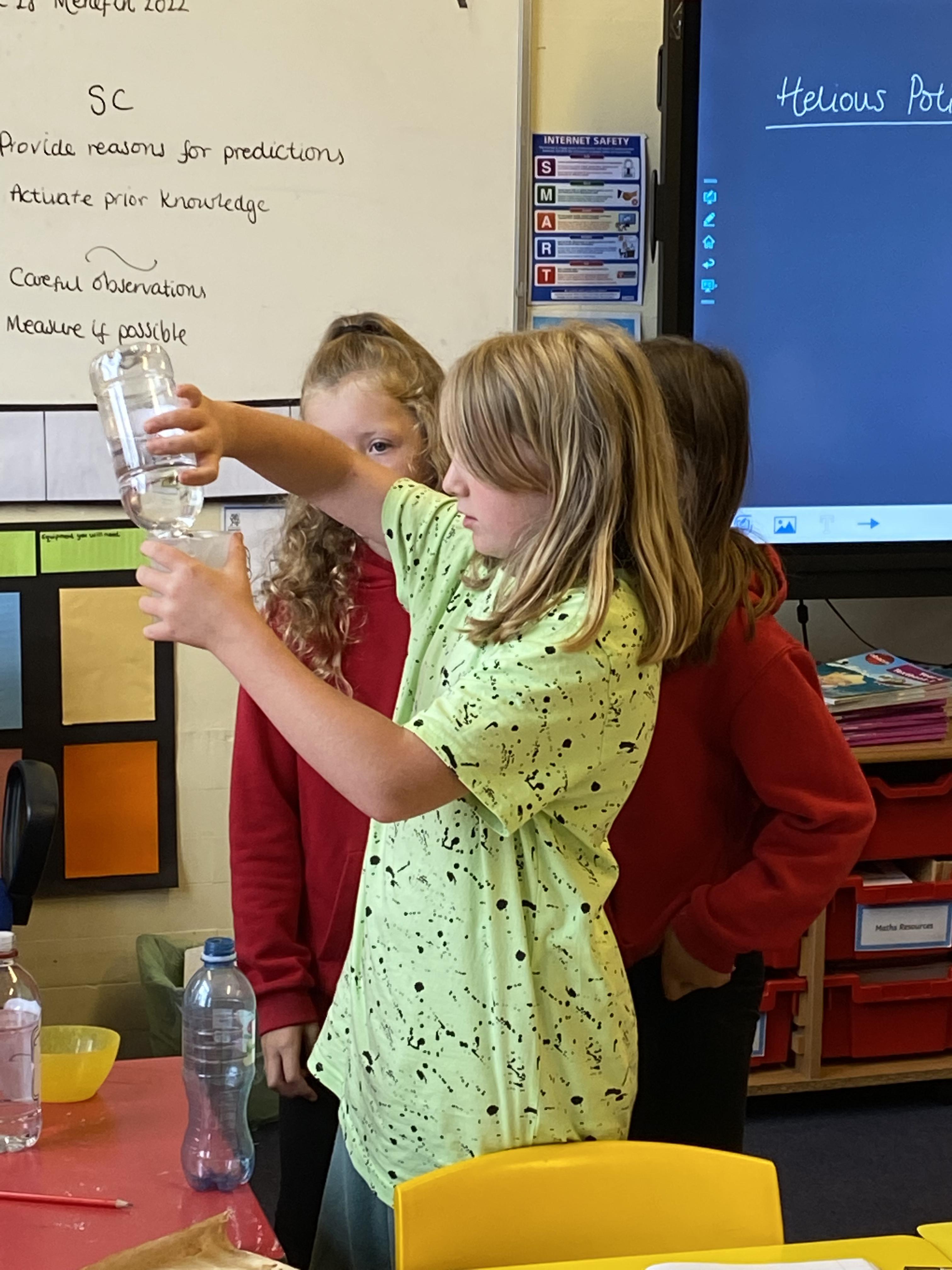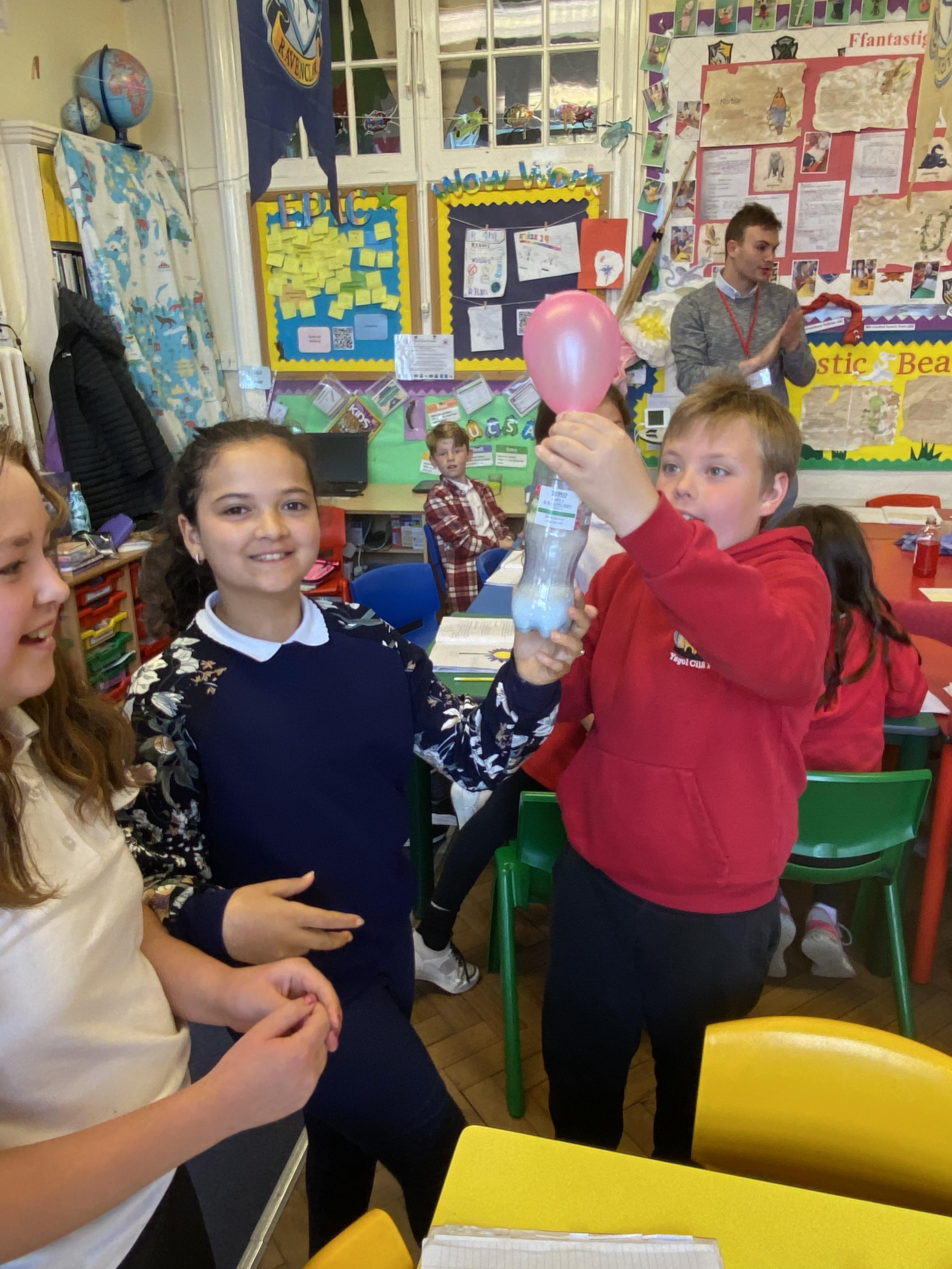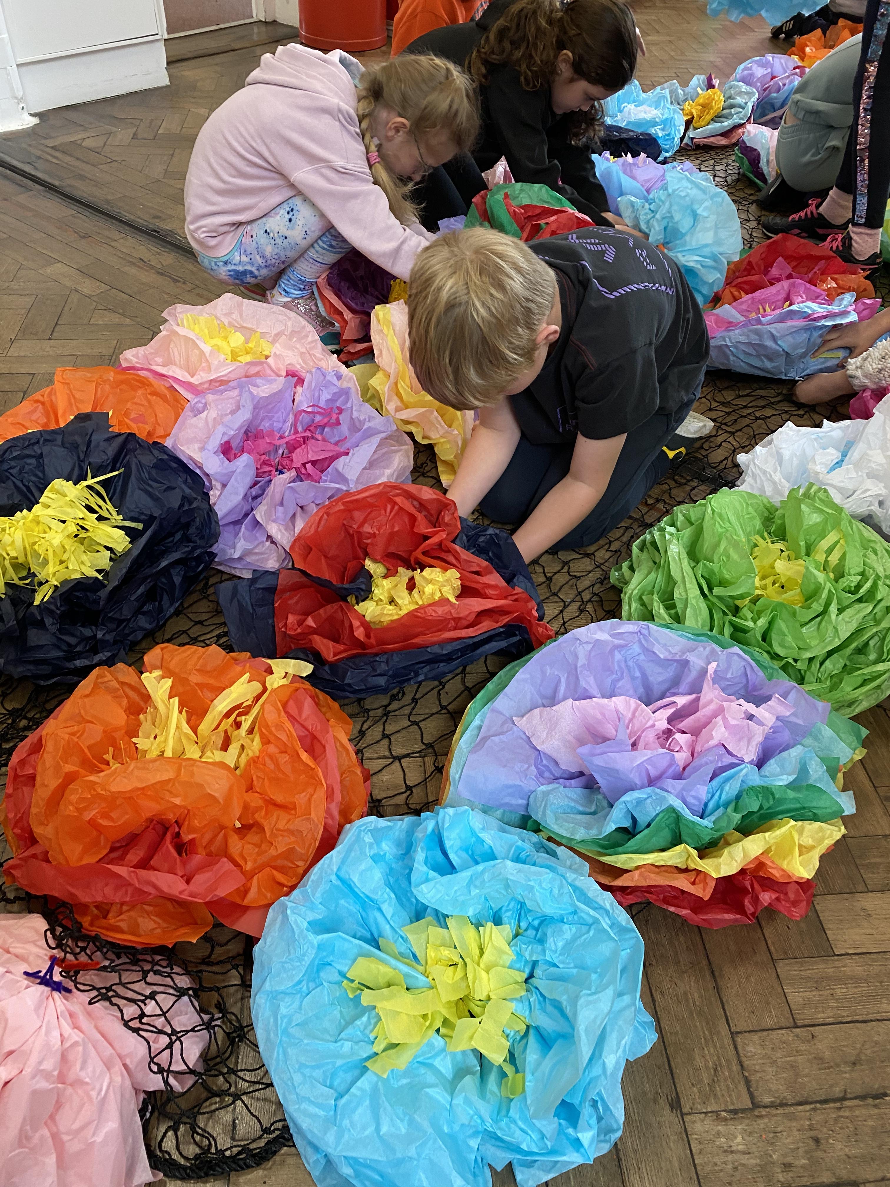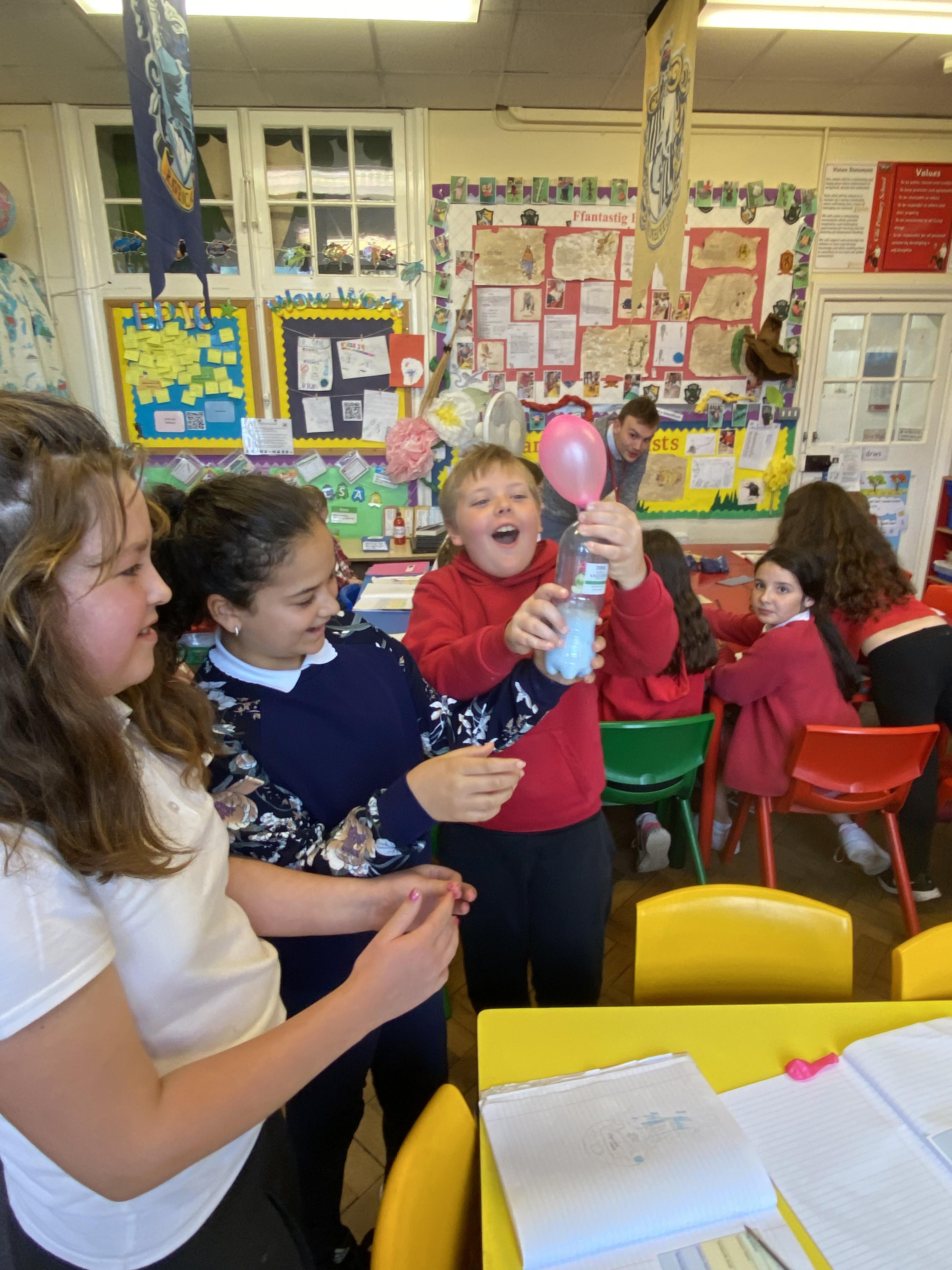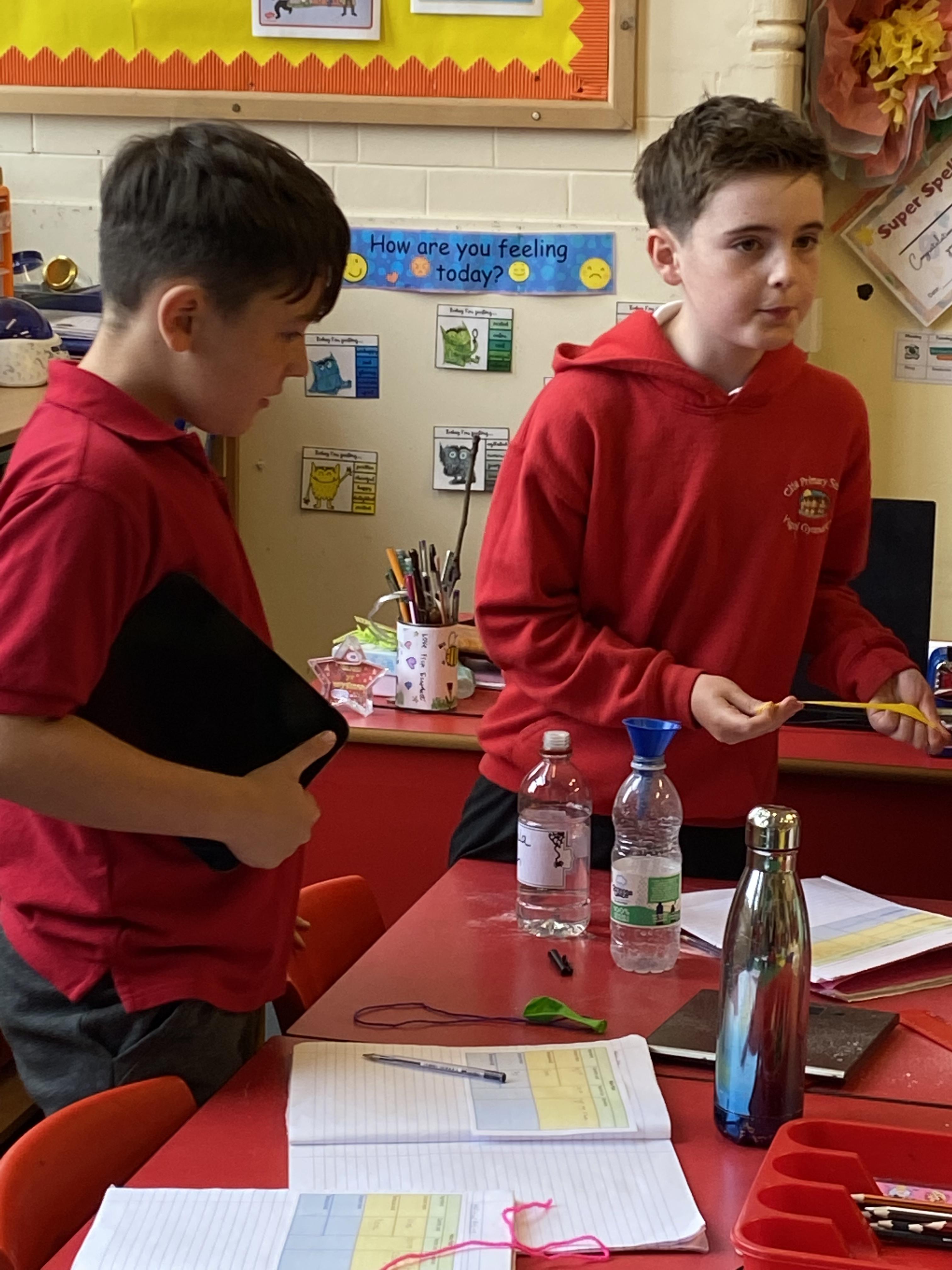 We made some hot-air balloons out of crepe paper, then used a hair dryer to heat up the air inside them