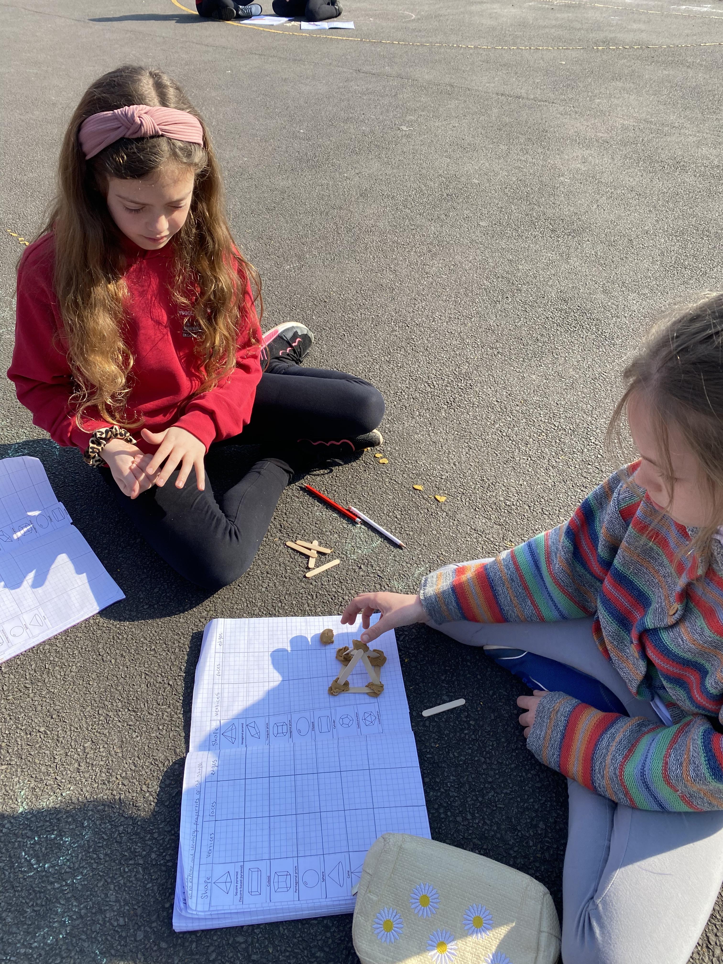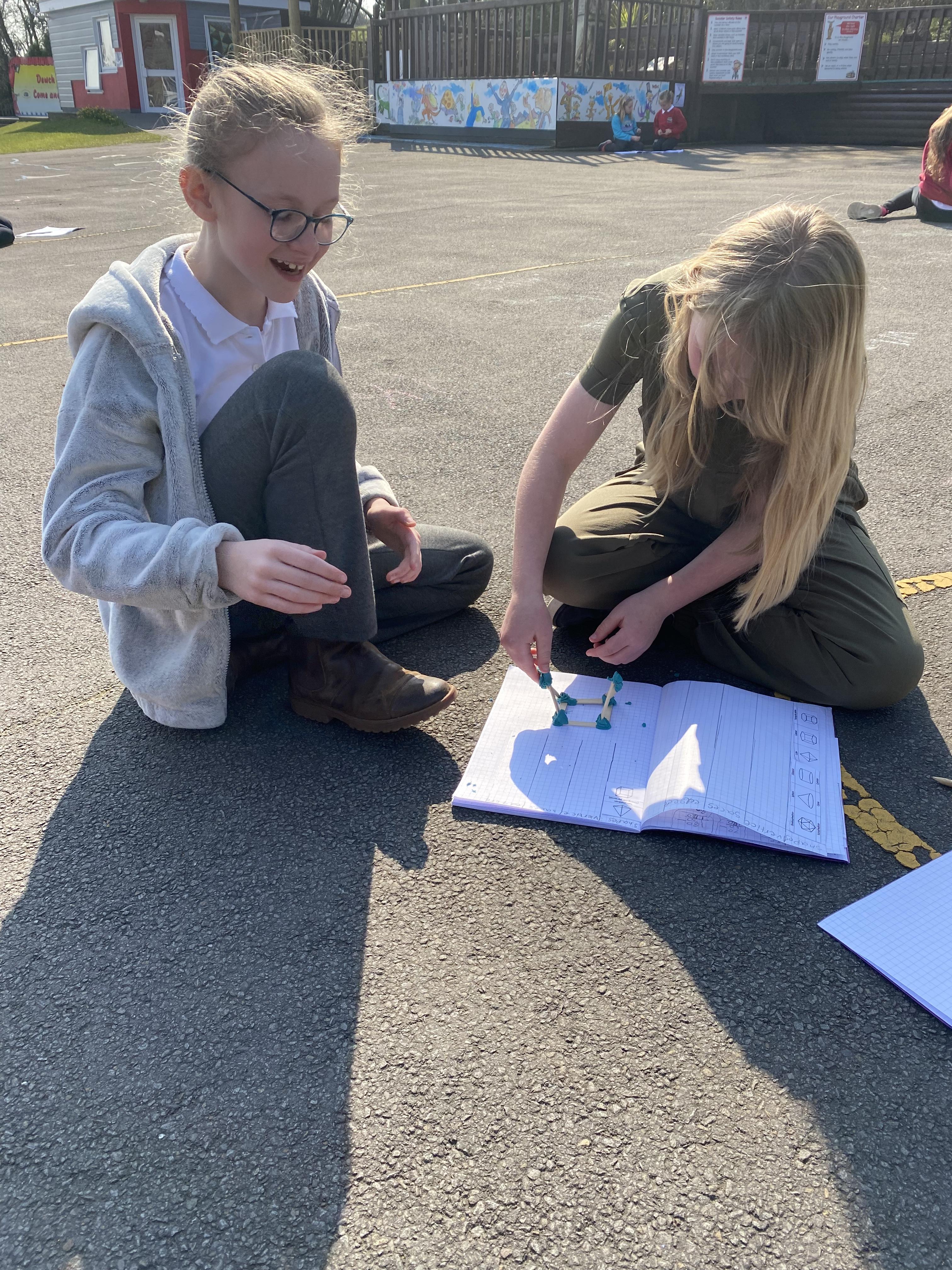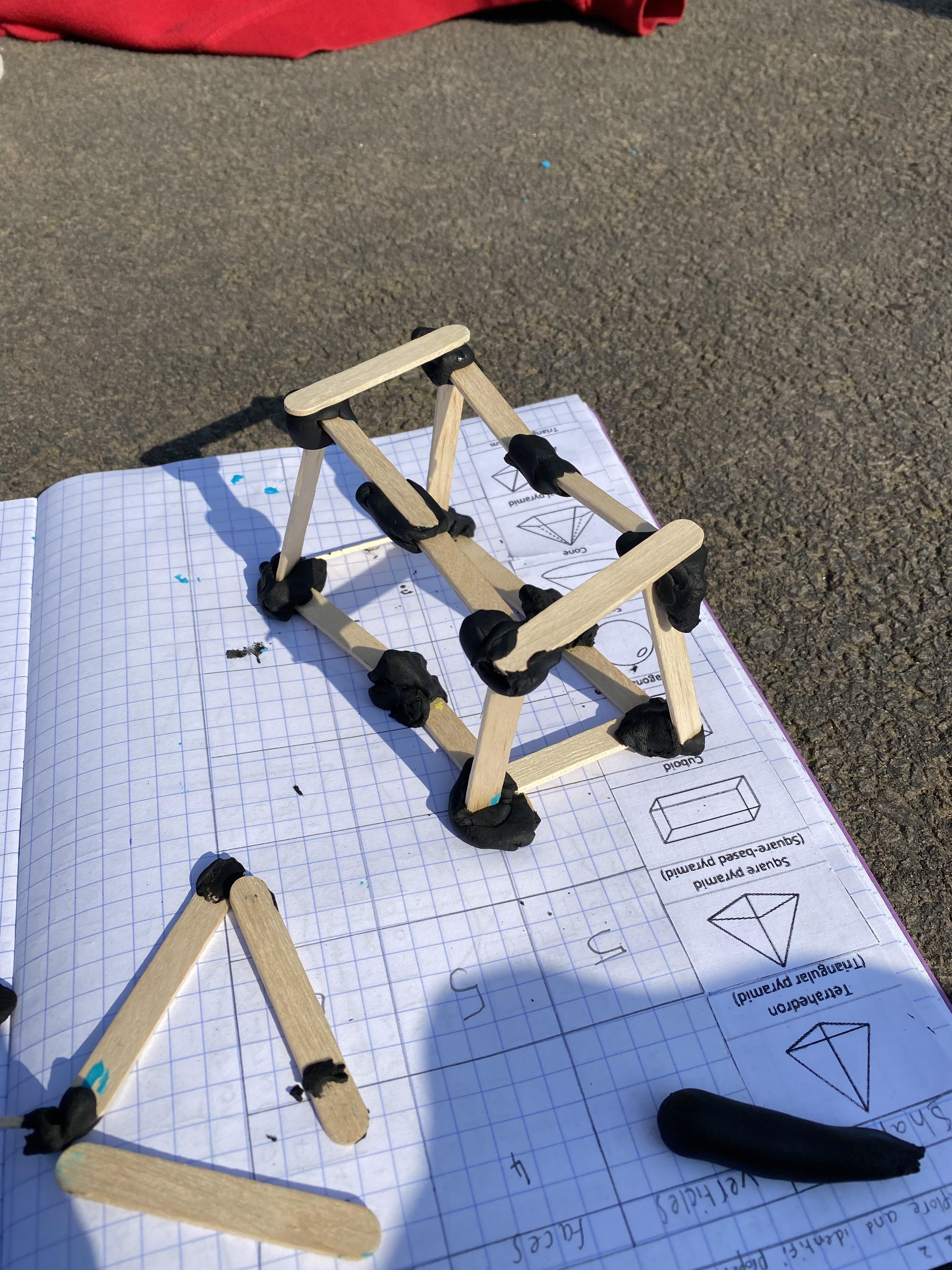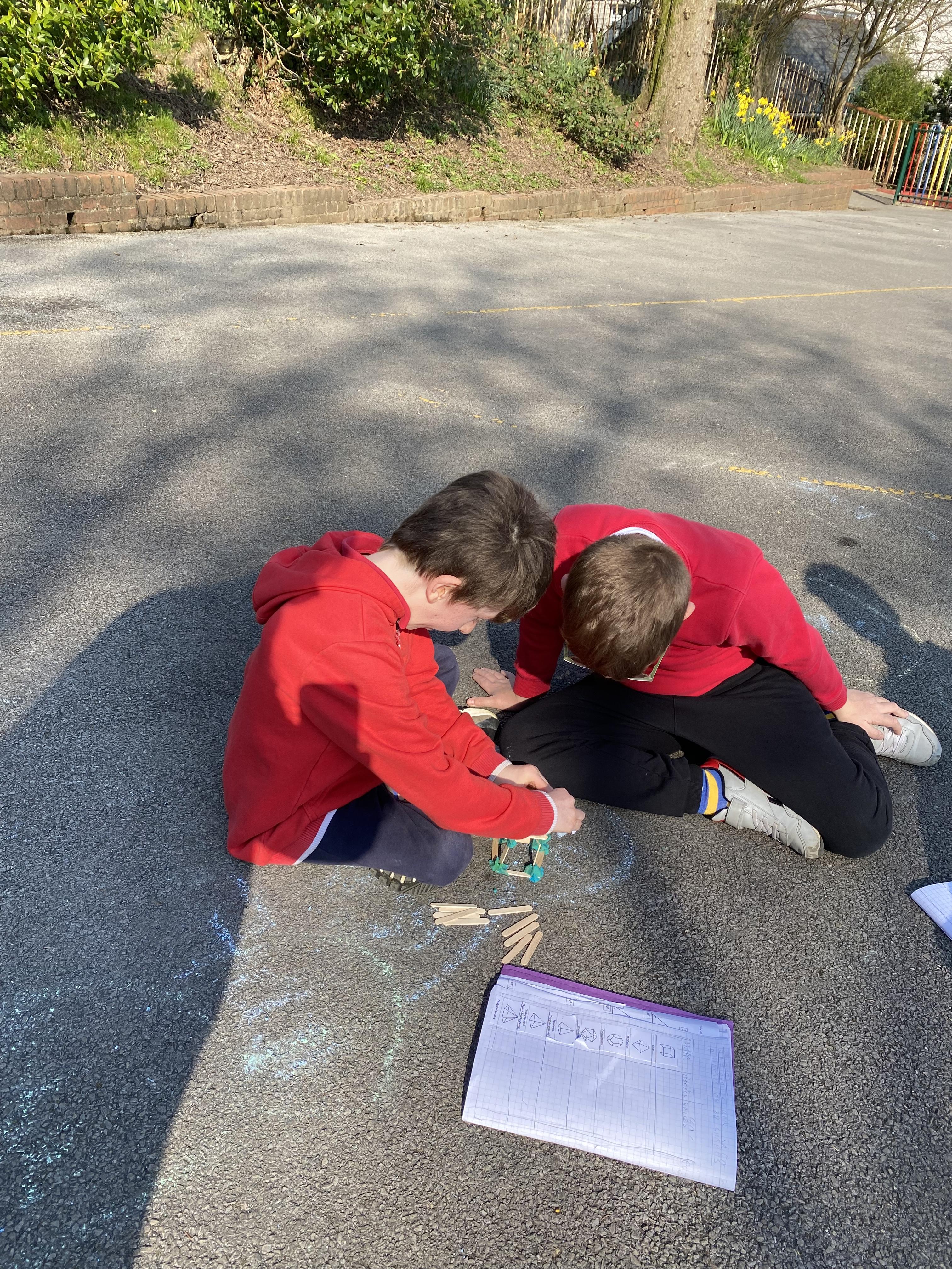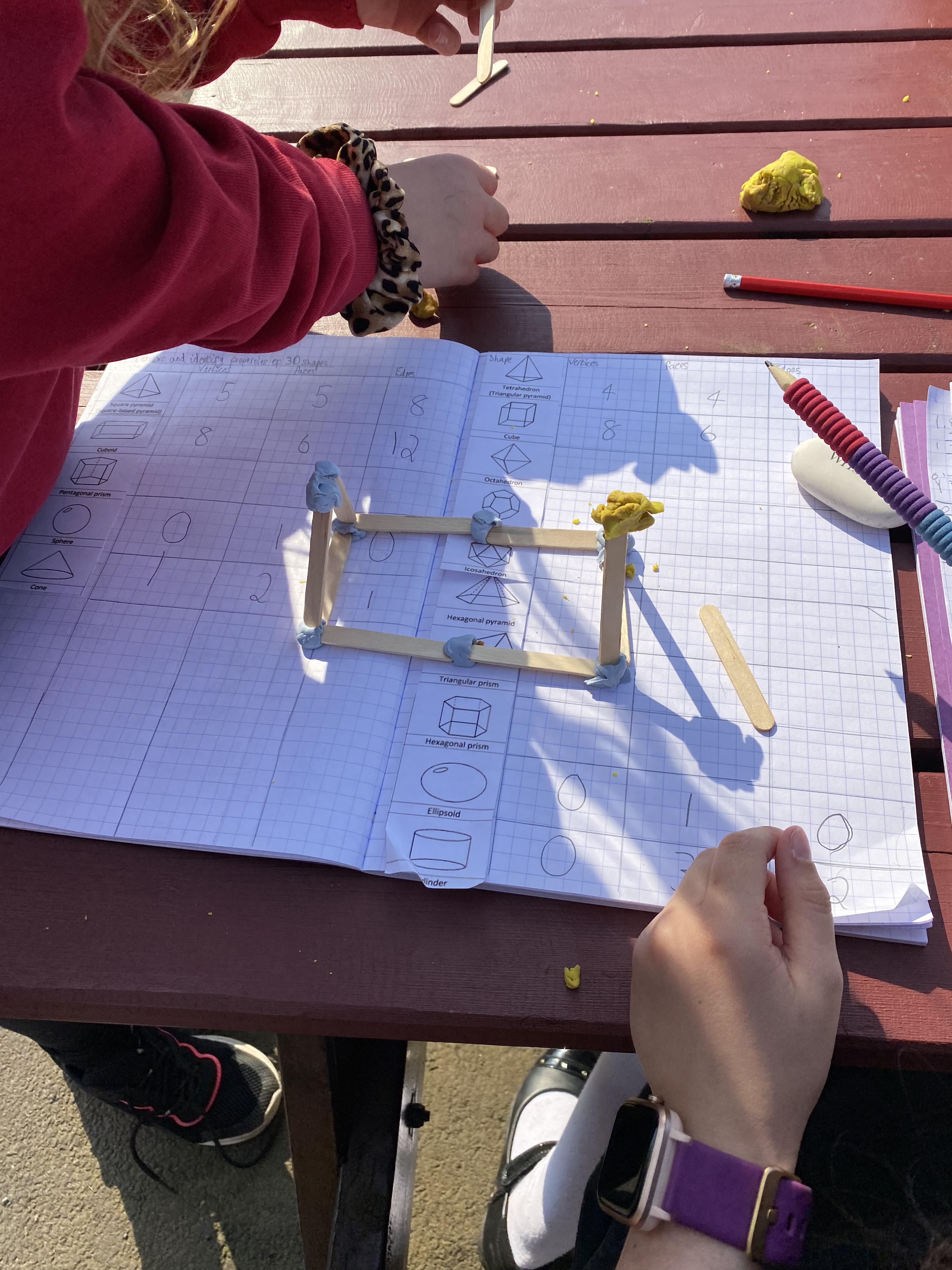 We took advantage of the beautiful weather by taking our maths outside today. We found out about the properties of 3D shapes by making some!