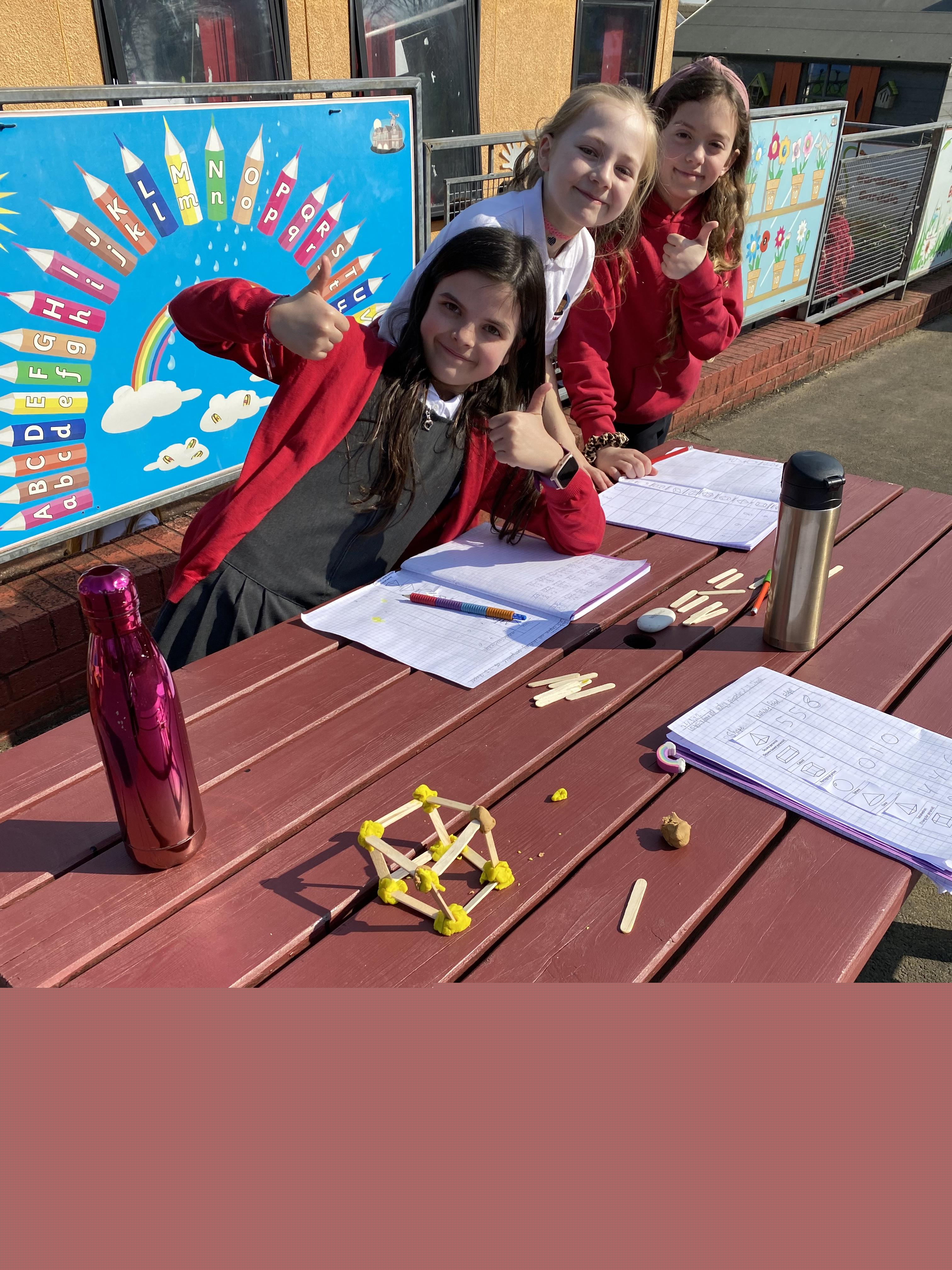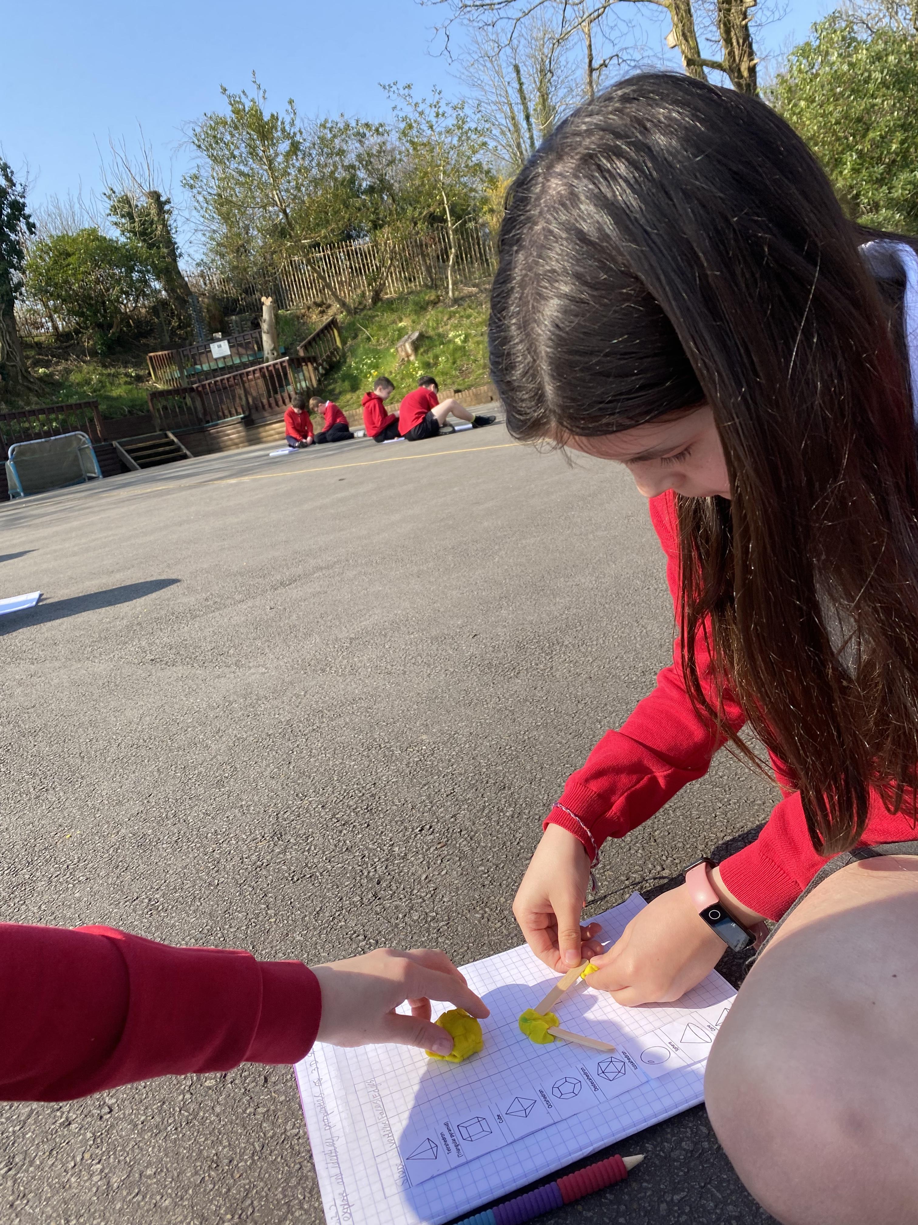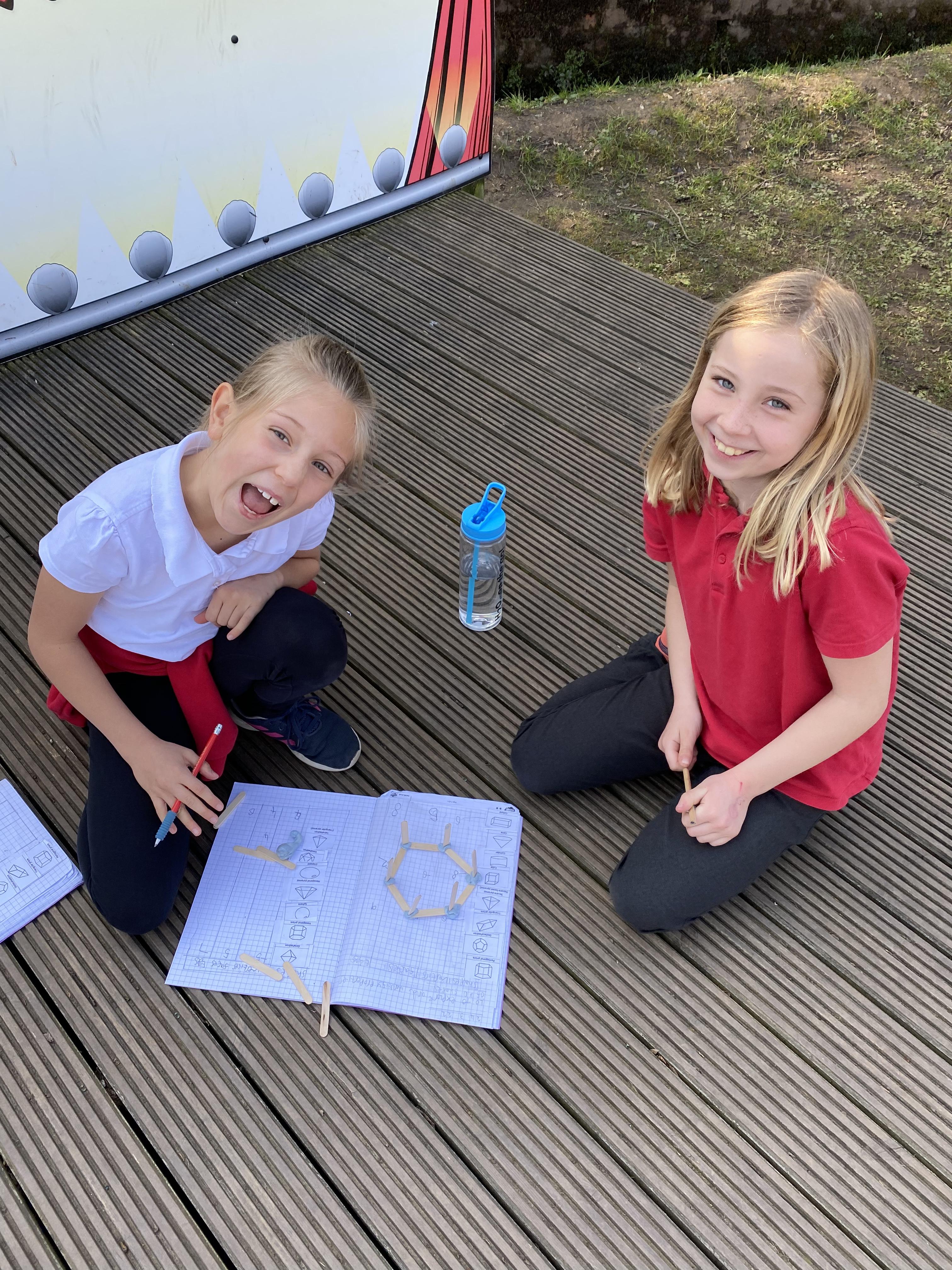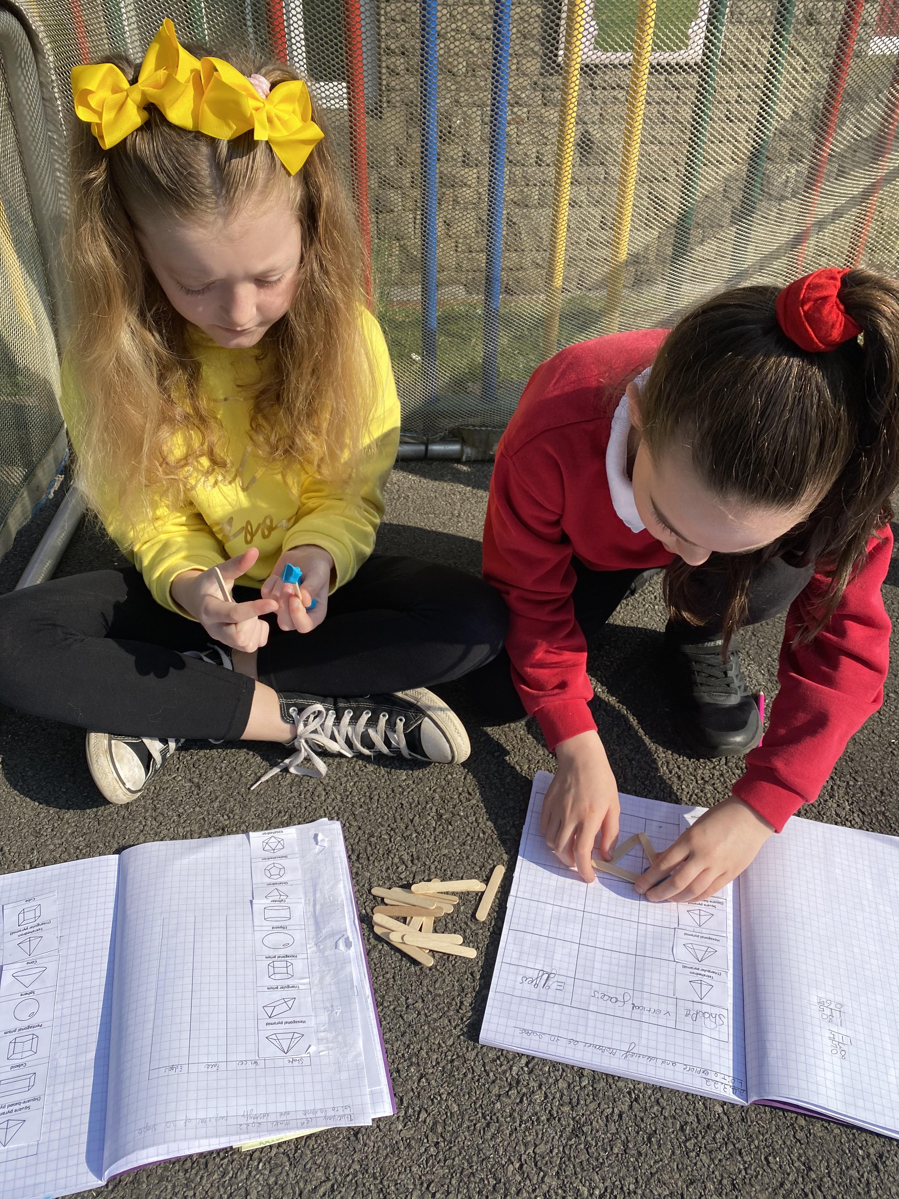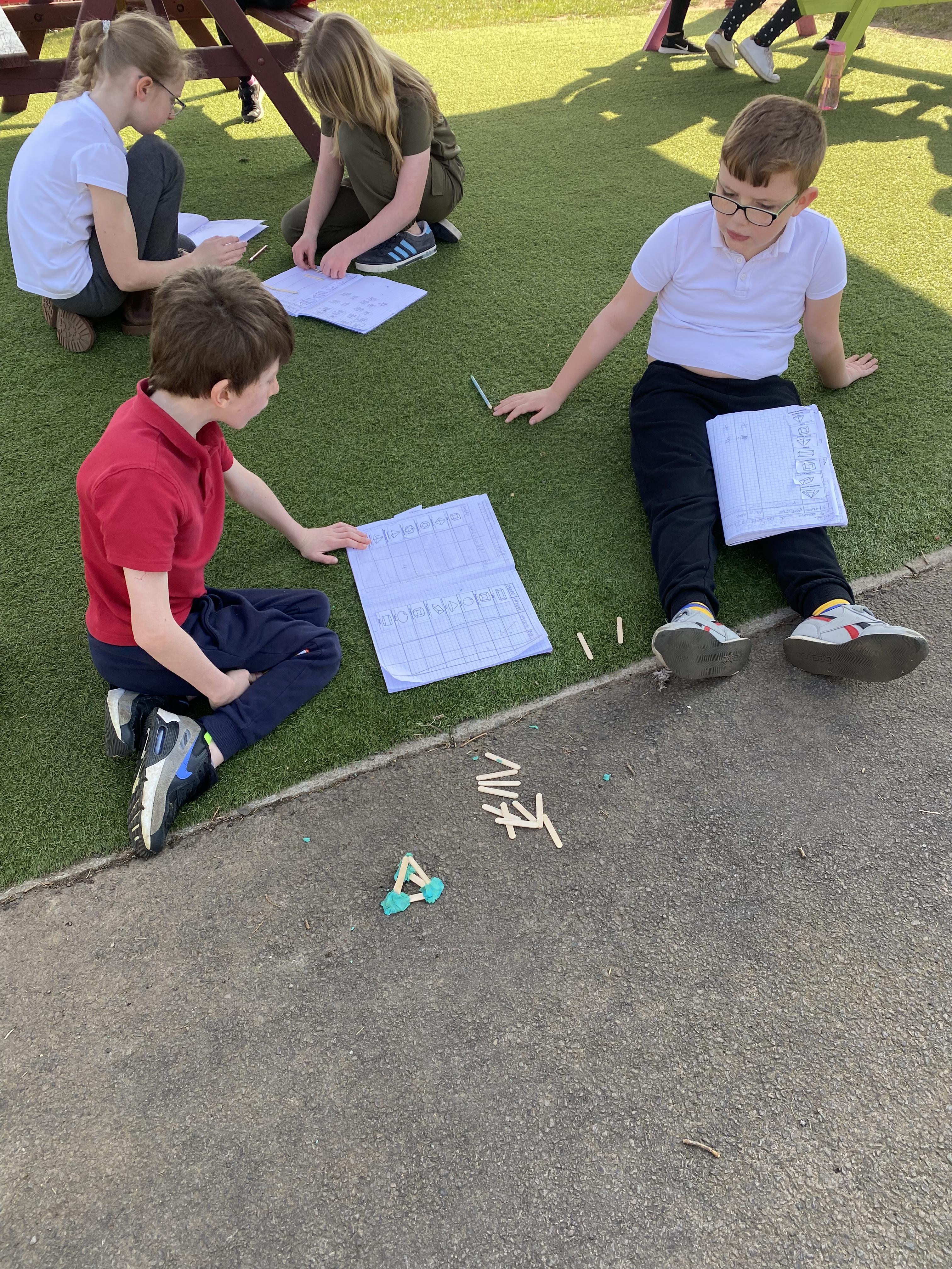 We took advantage of the beautiful weather by taking our maths outside today. We found out about the properties of 3D shapes by making some!