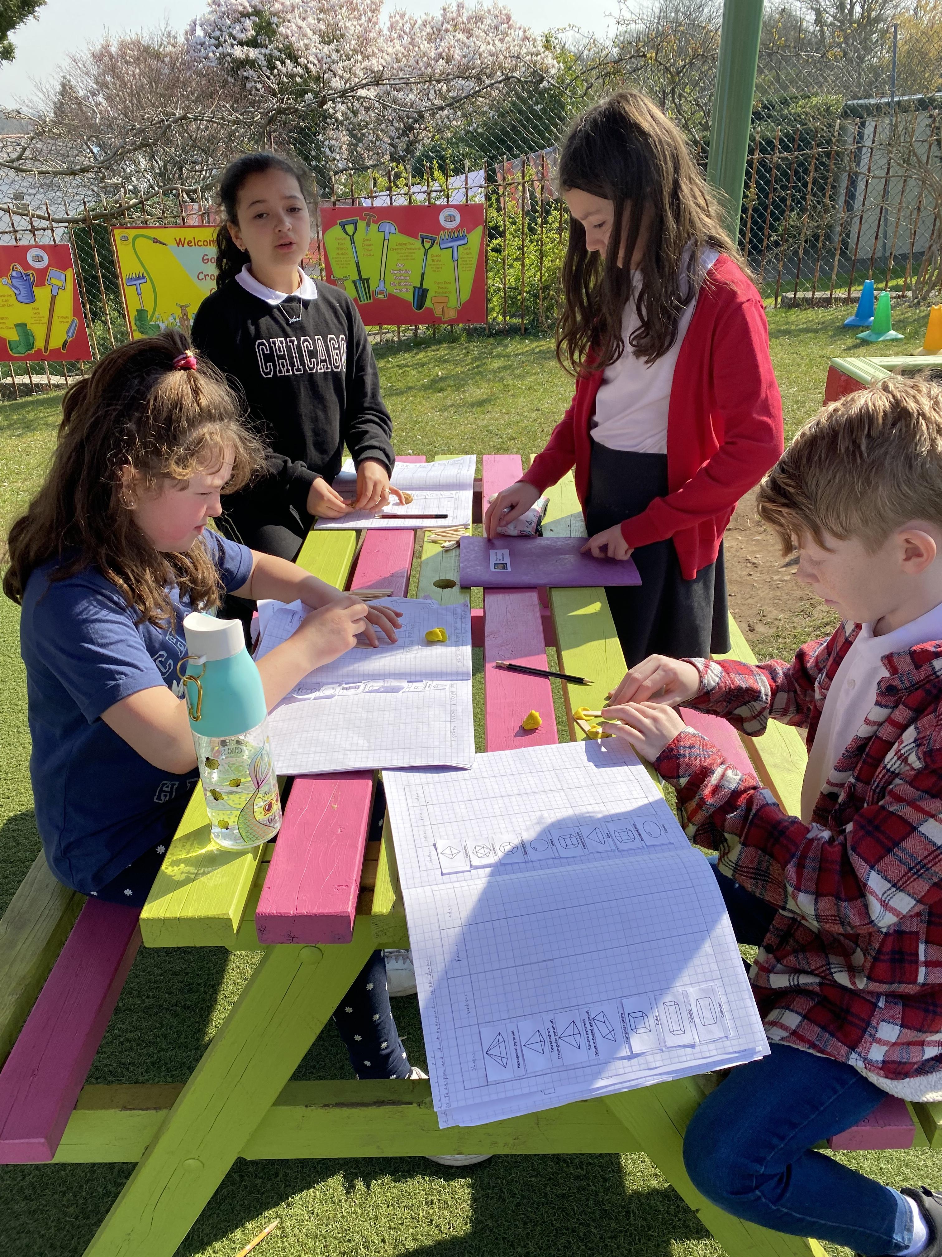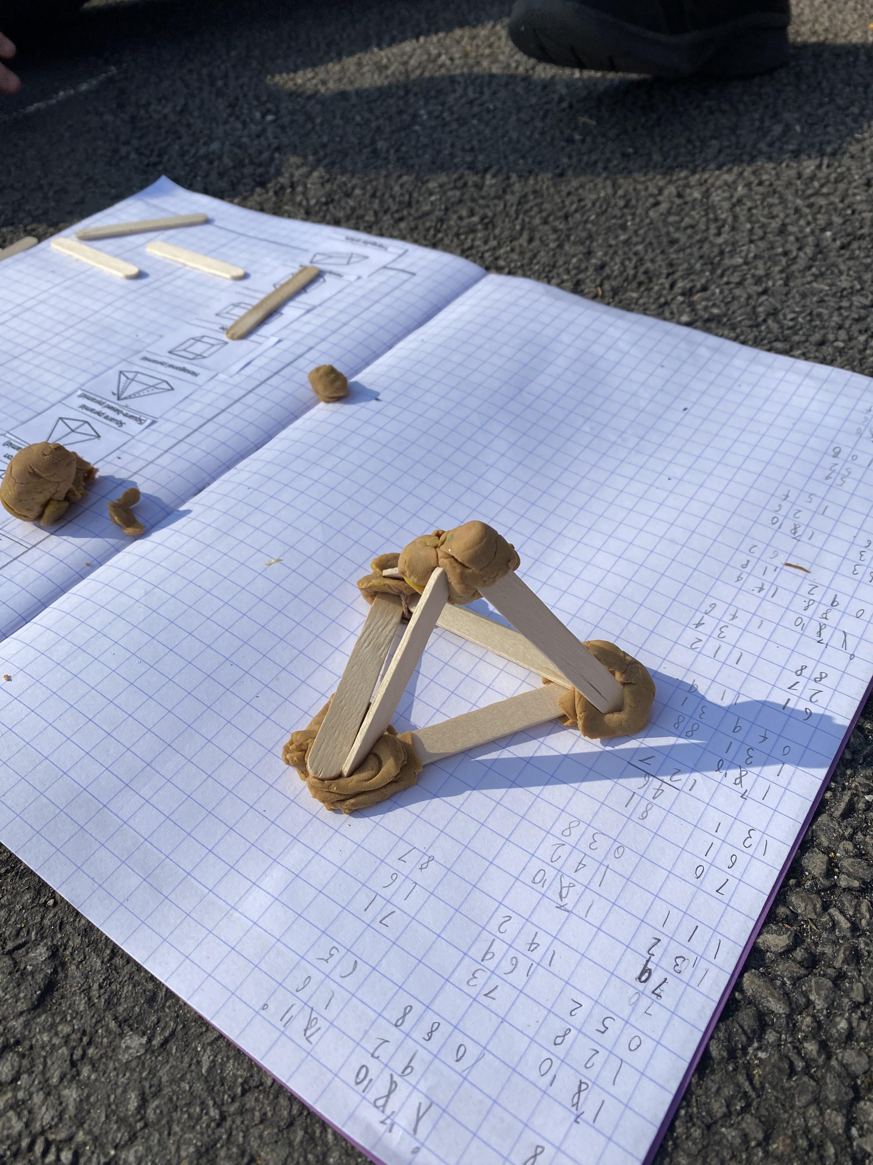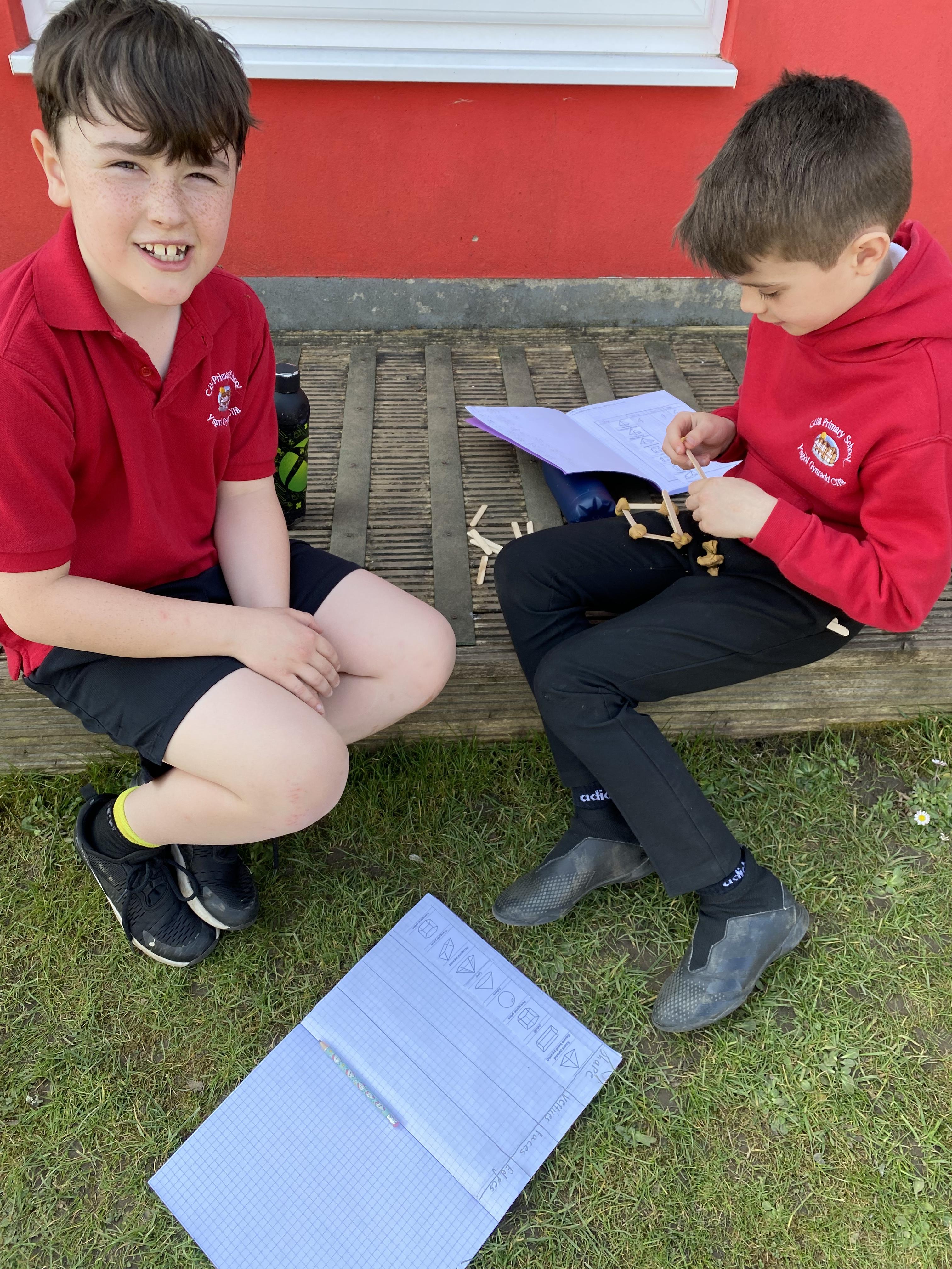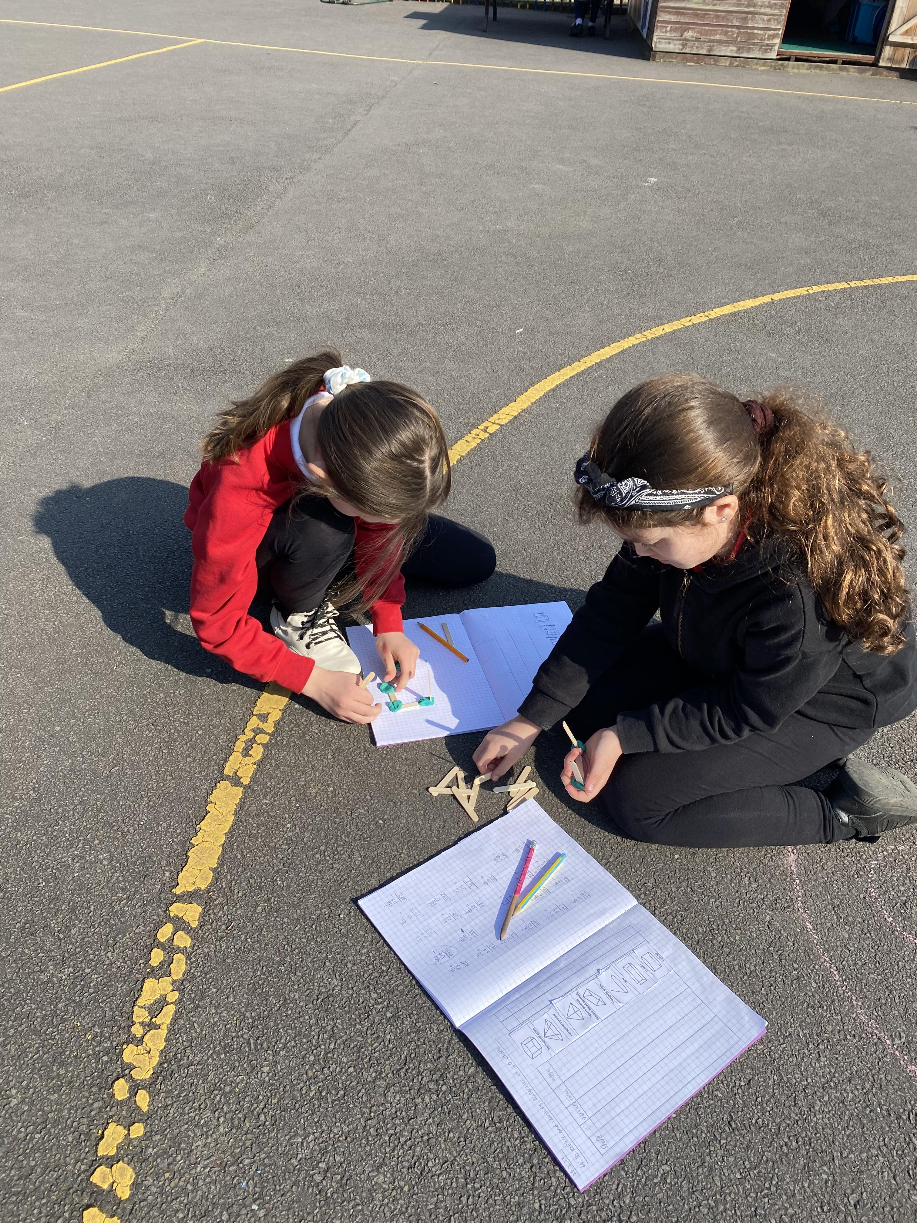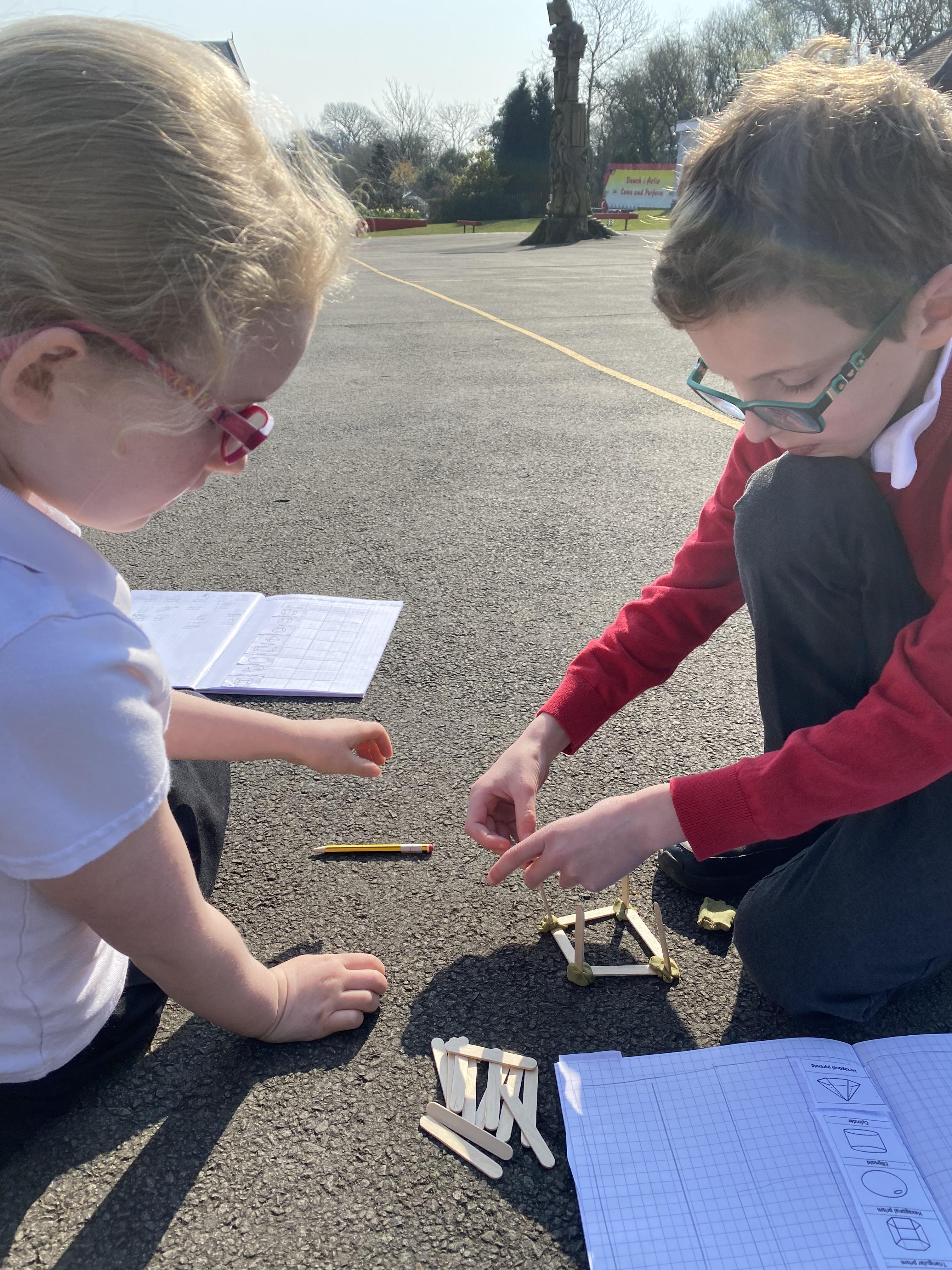 We took advantage of the beautiful weather by taking our maths outside today. We found out about the properties of 3D shapes by making some!