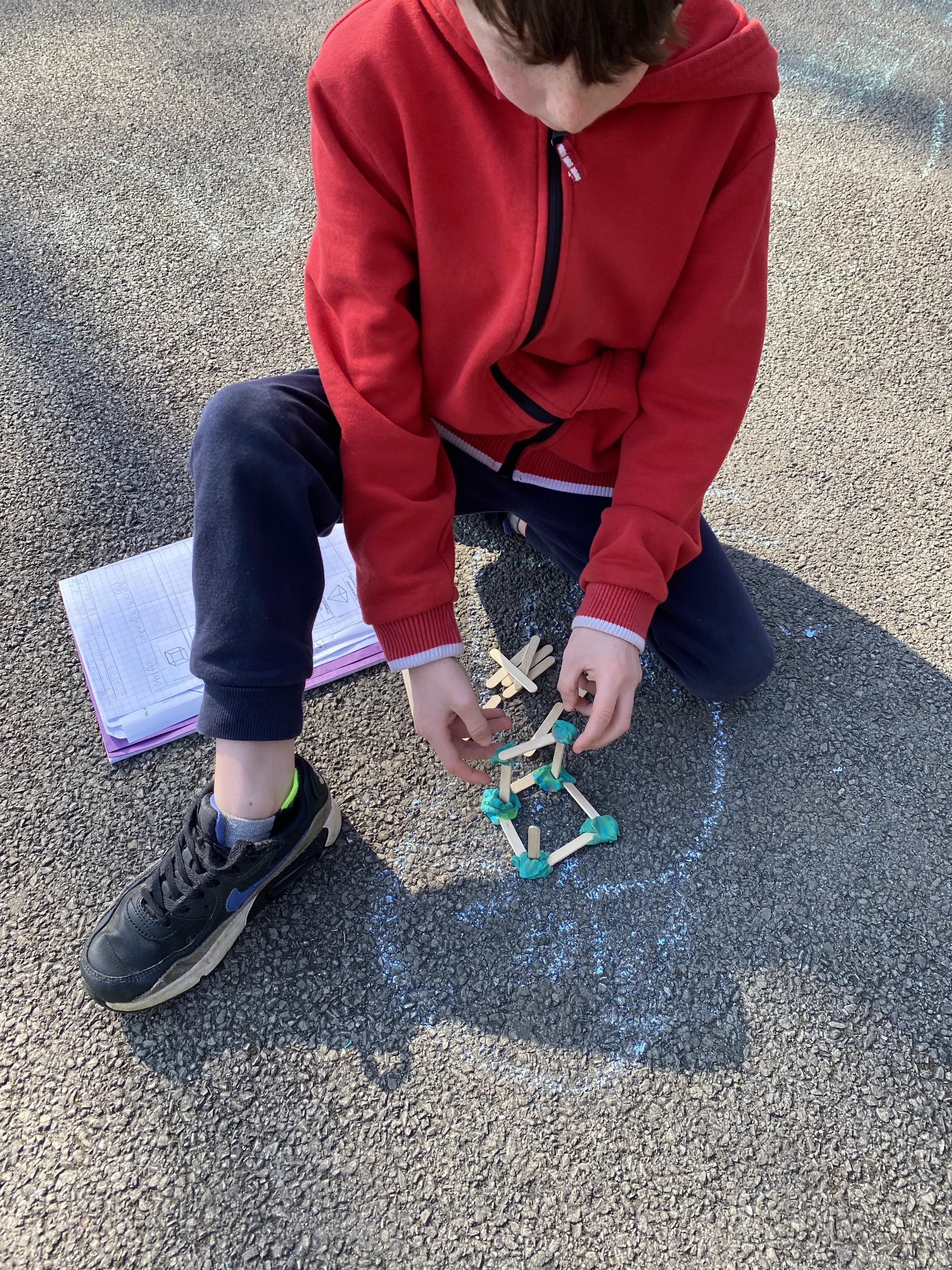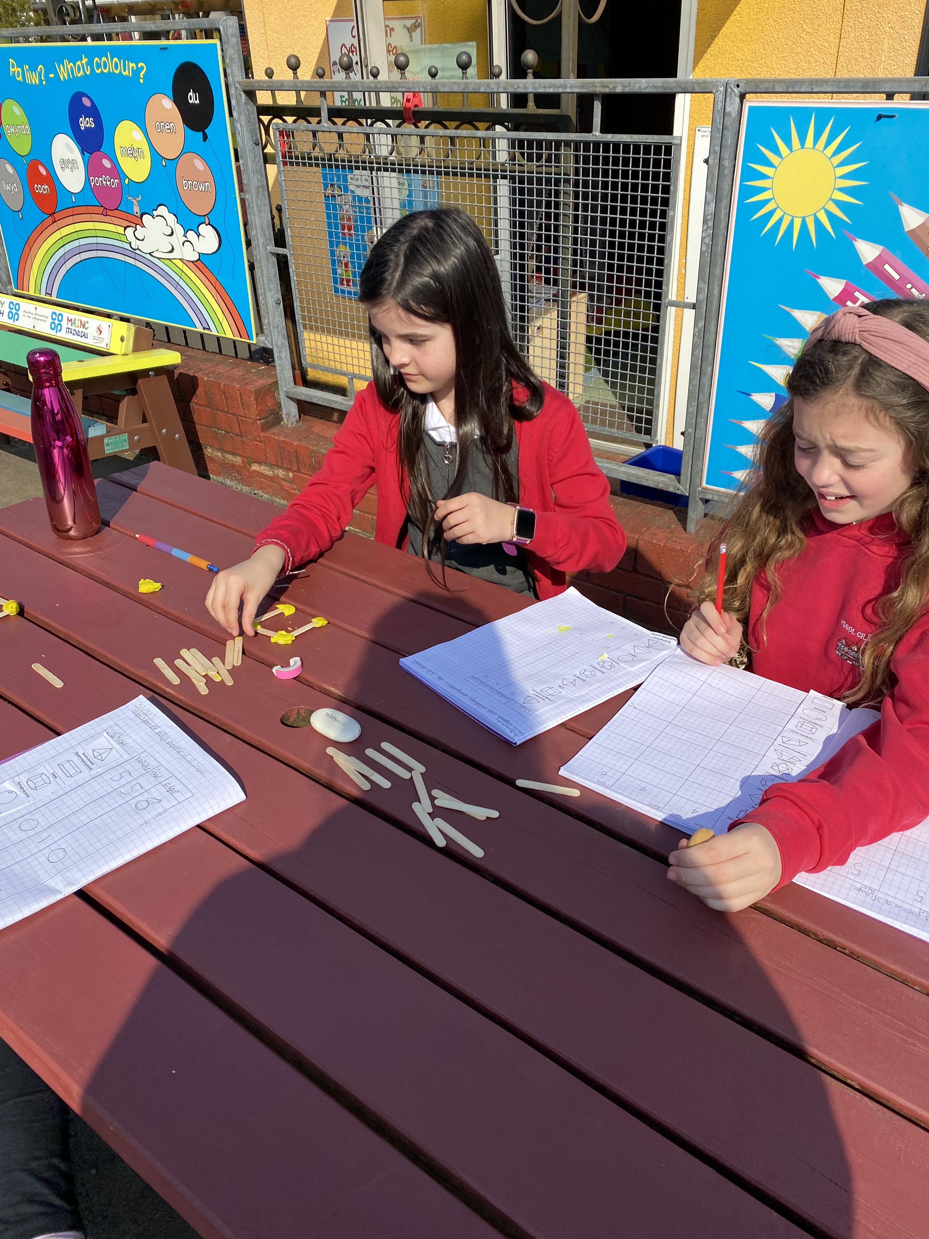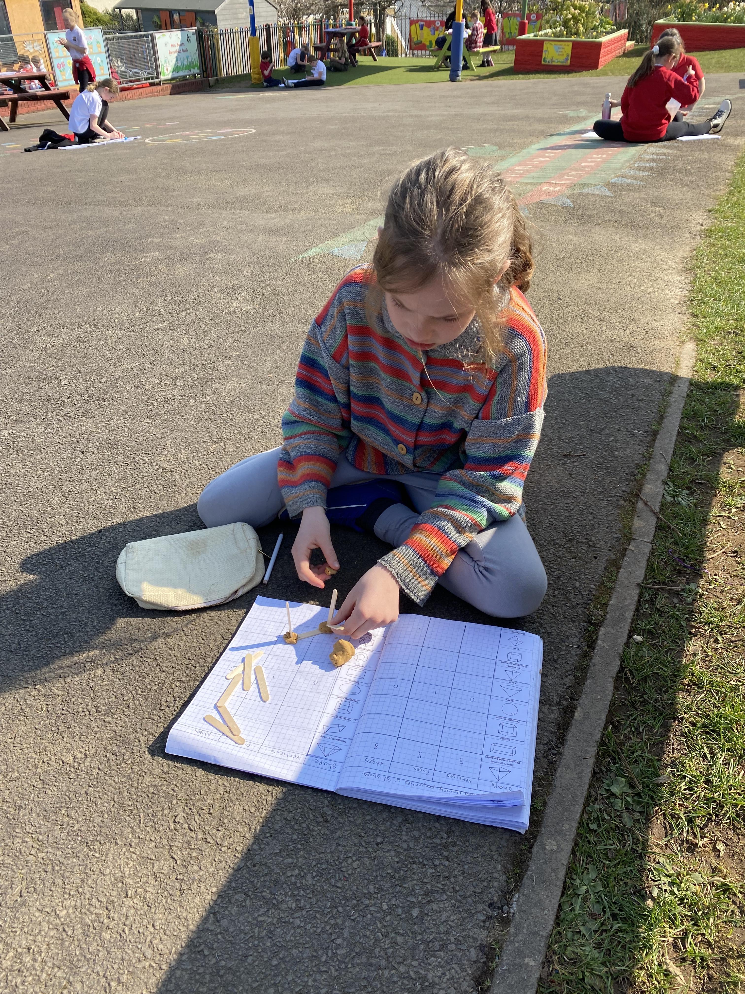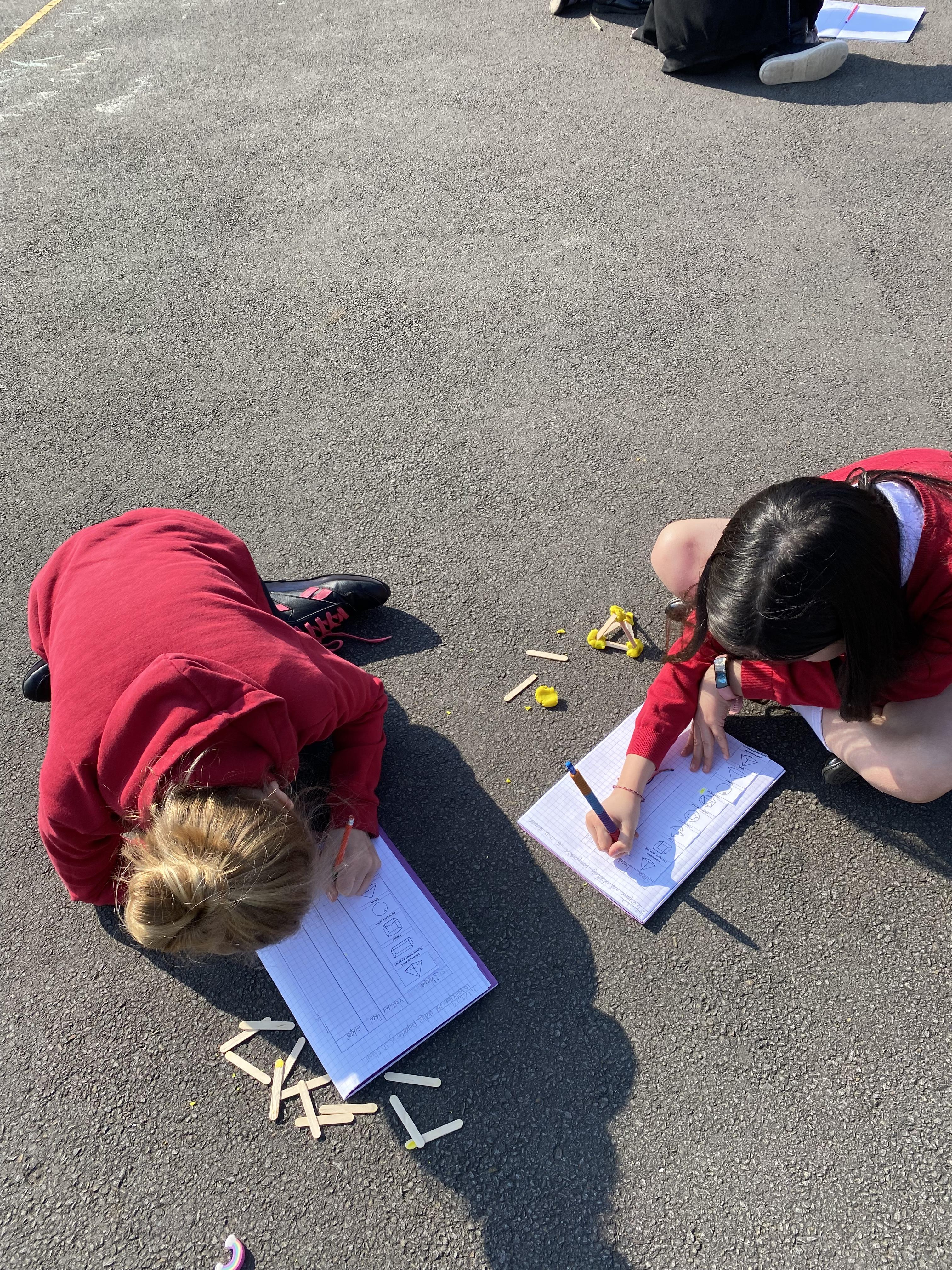 We took advantage of the beautiful weather by taking our maths outside today. We found out about the properties of 3D shapes by making some!
