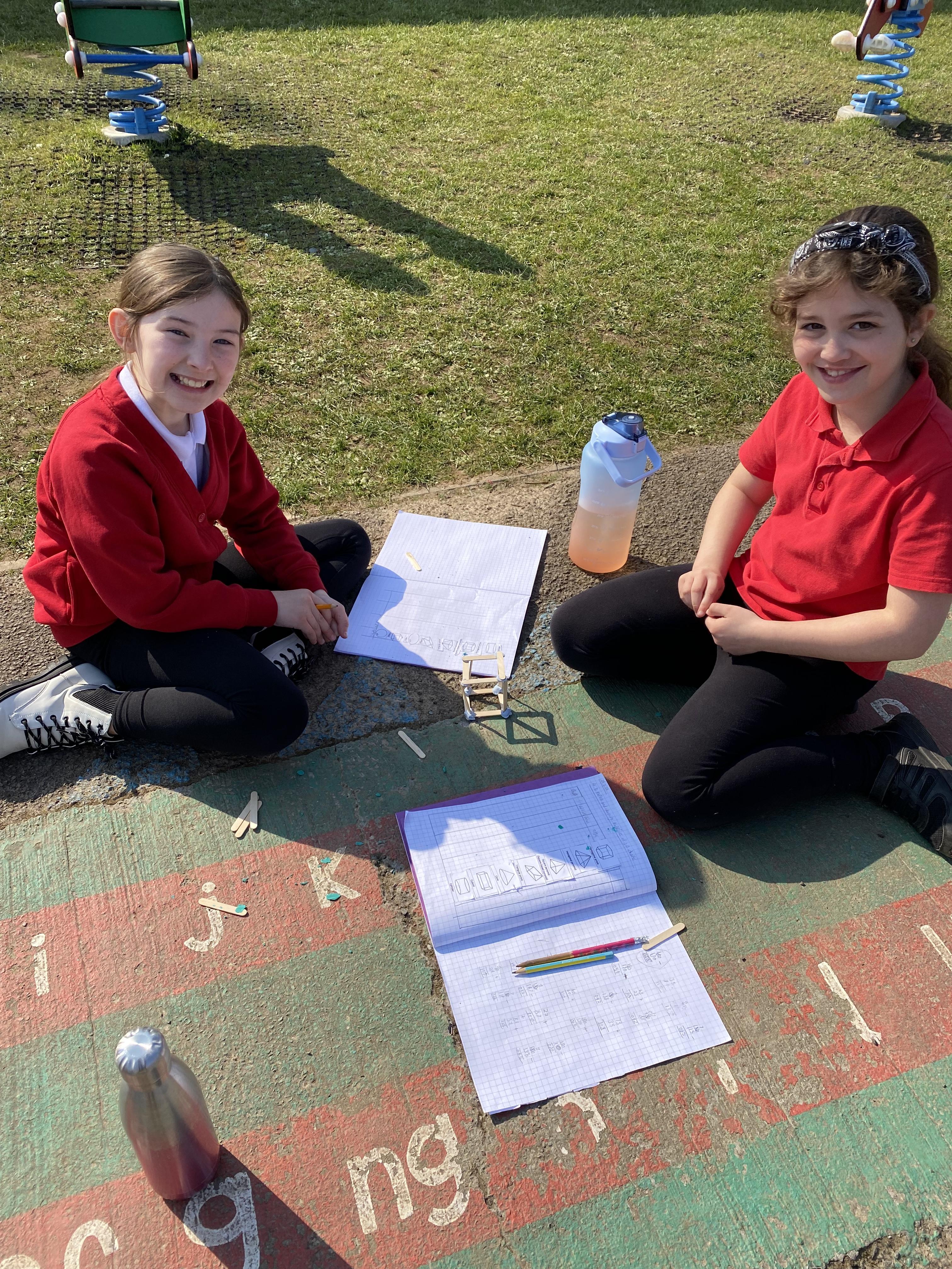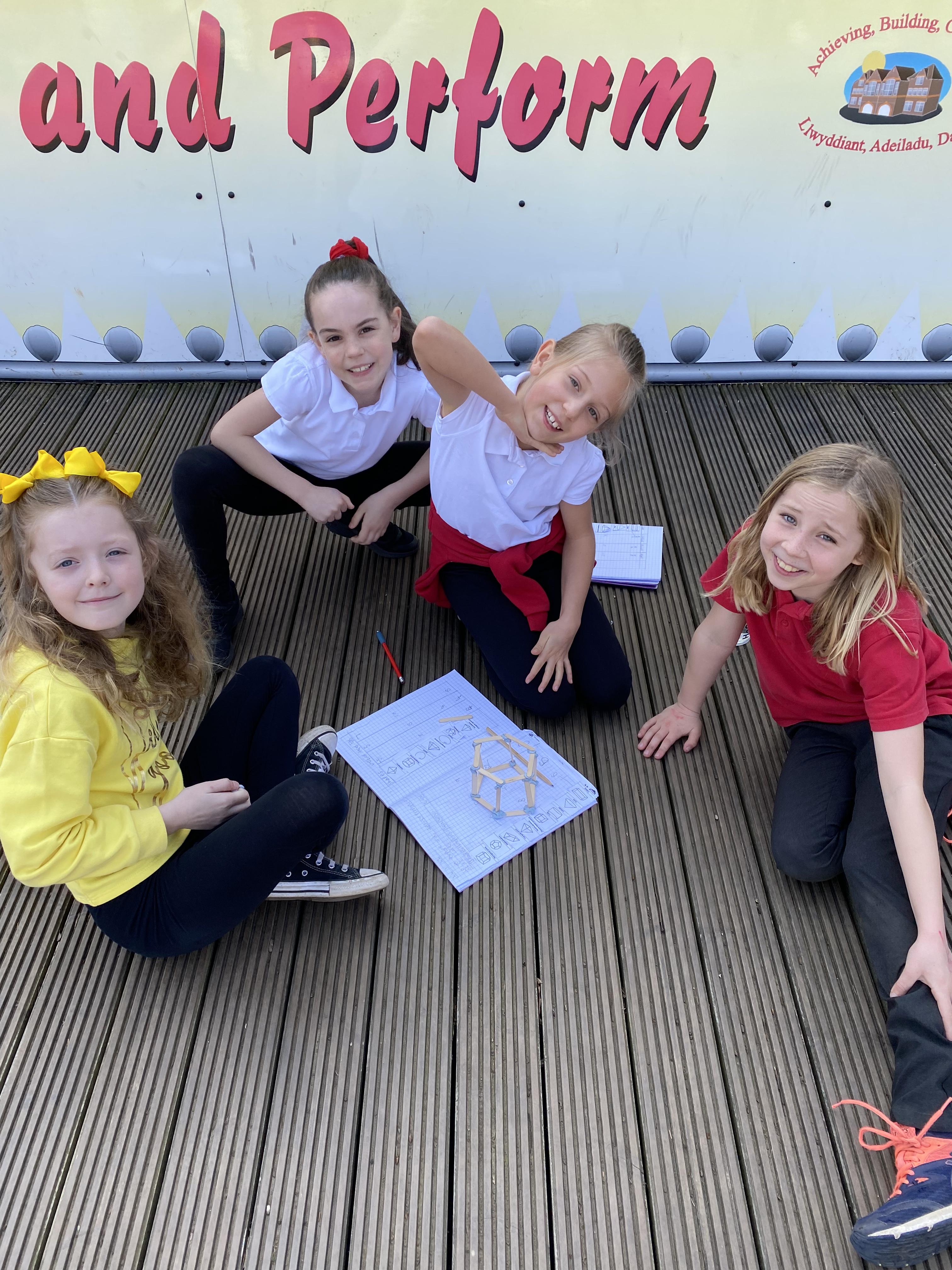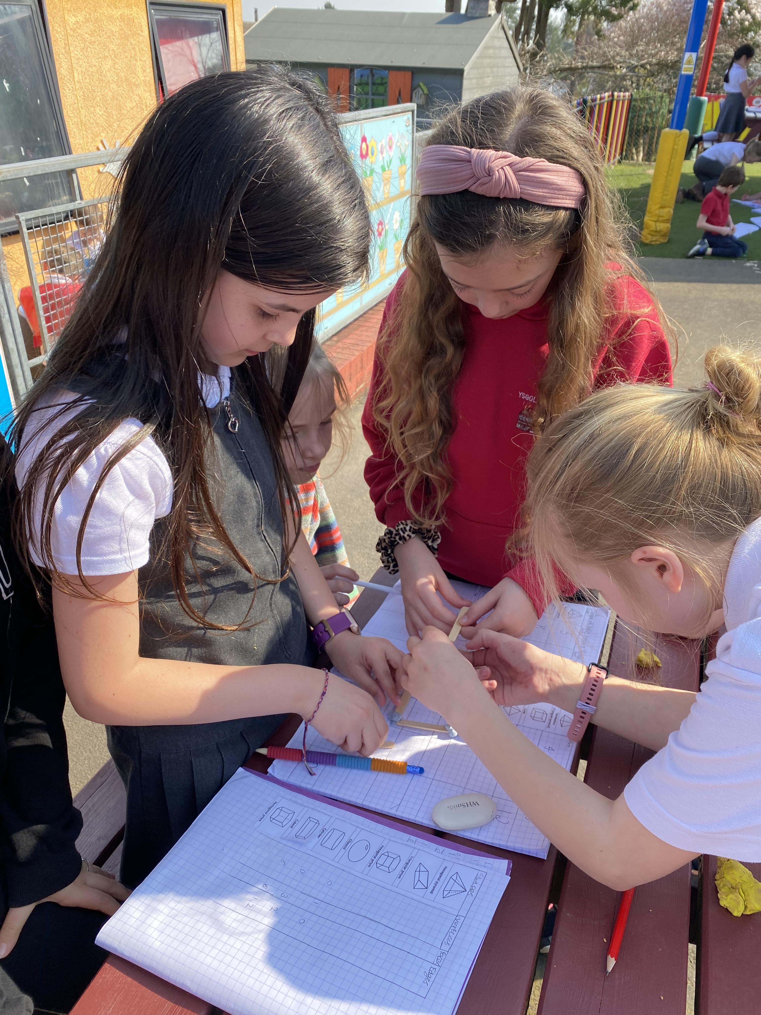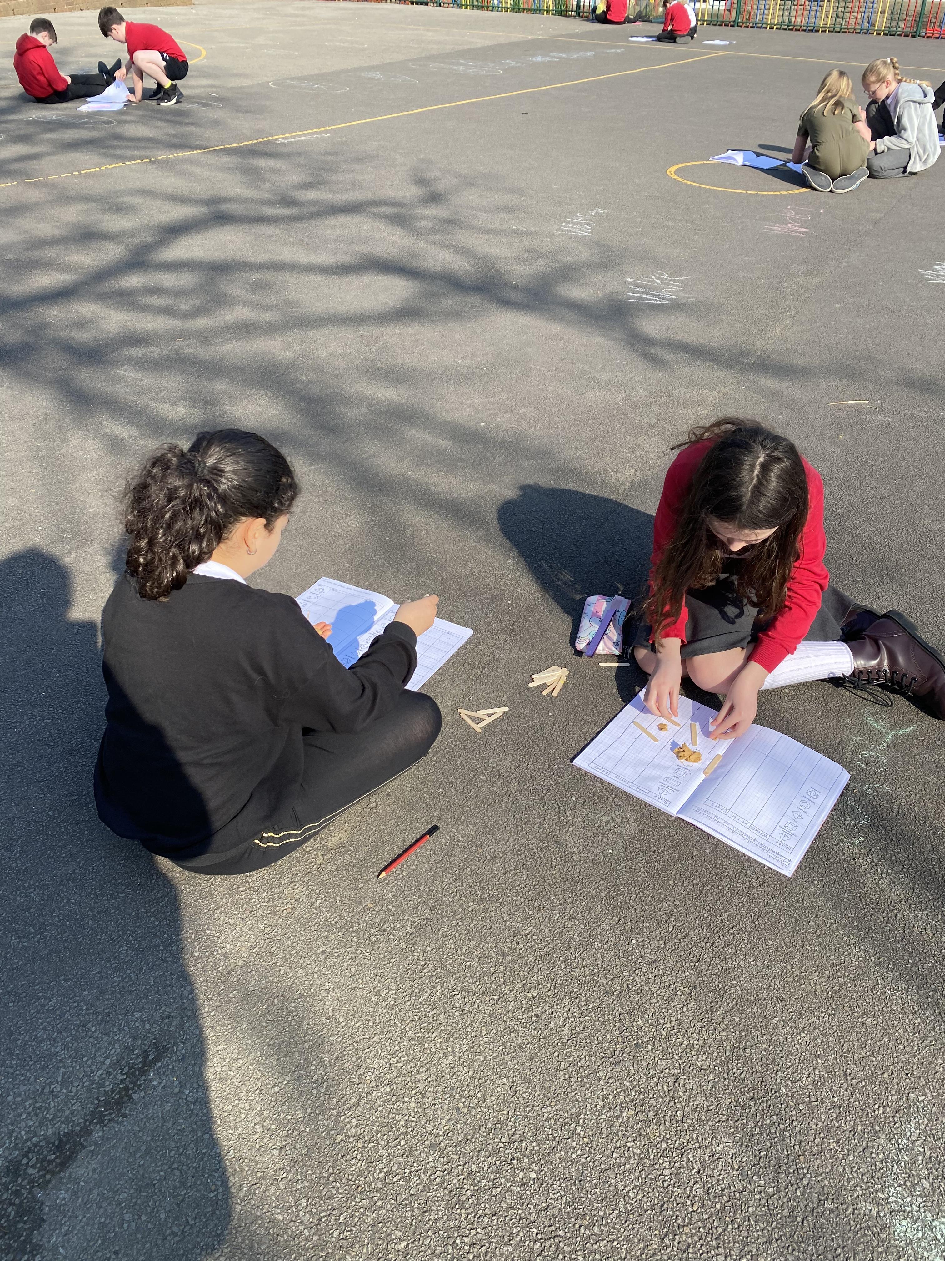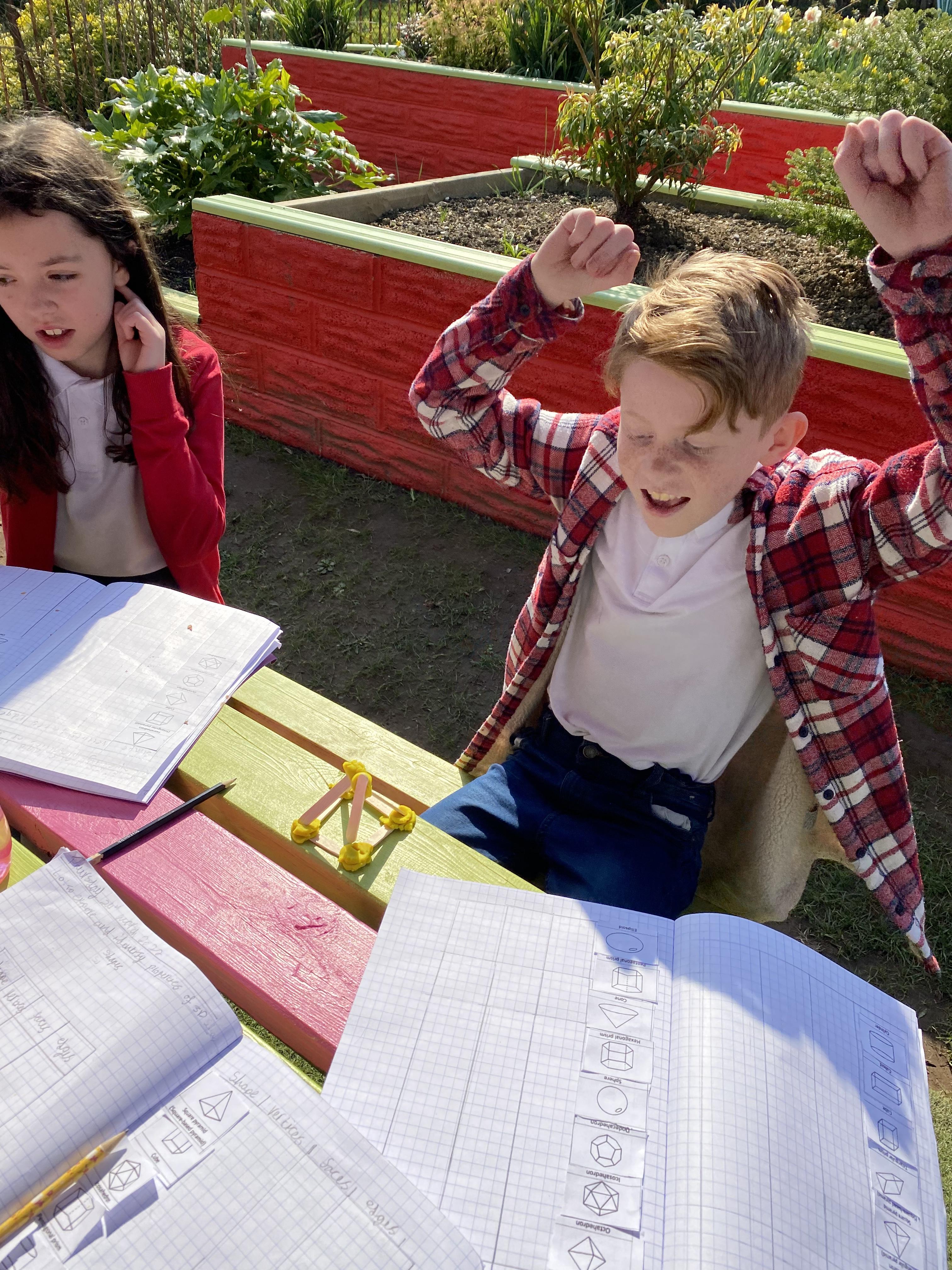 We took advantage of the beautiful weather by taking our maths outside today. We found out about the properties of 3D shapes by making some!